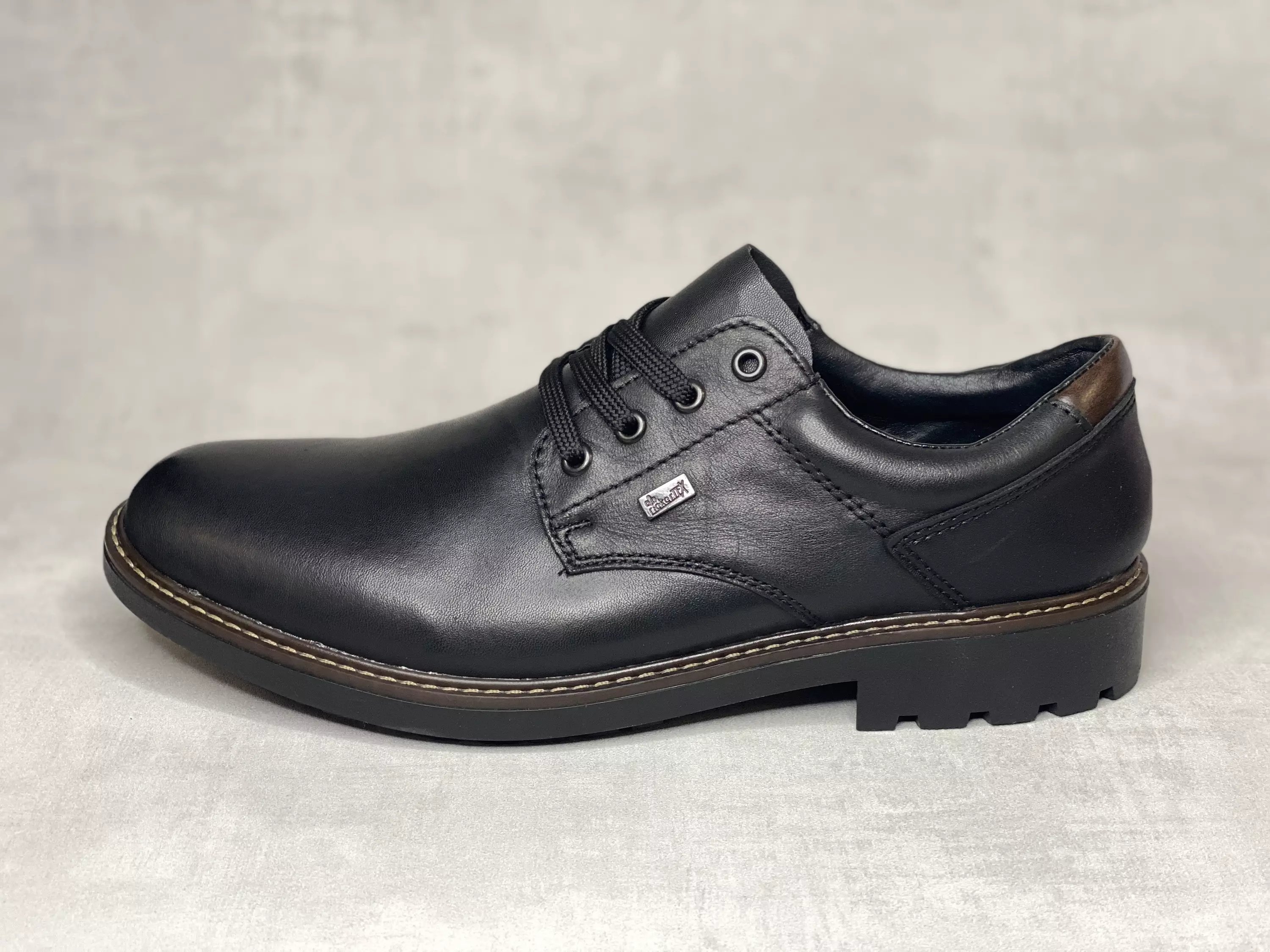 Mustat Rieker kävelykengät. Rieker-Tex kalvolla varustetut nauhalliset miesten kävelykengät. Kannassa pieni tummanruskea yksityiskohta.