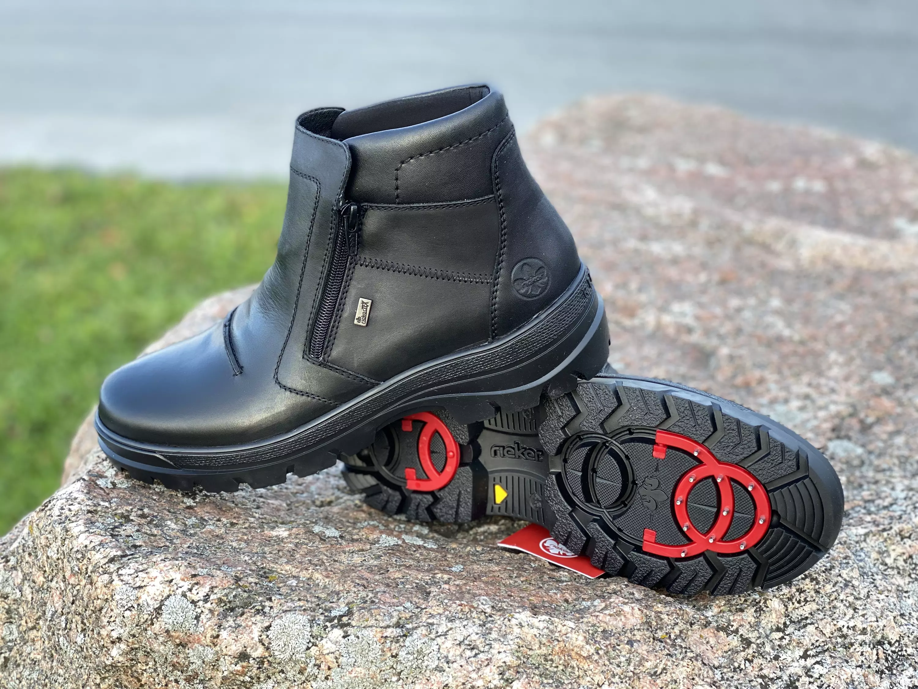 Mustat miesten Rieker talvinilkkurit. Nämä nahkaiset nilkkurit ovat villavuoriset ja varustettu kahdella pukemista helpottavalla vetoketjulla. Vaihdettavat pörröpintaiset (villaa) pohjalliset ovat vaihdettavat, joten tarpeen vaatiessa sujautaut niiden tilalle omia tarpeitasi parhaiten vastaavat pohjalliset. Käännettävät nastat on helppo kääntää käyttöön ja pois tarpeen mukaan. RiekerTex kalvo pitää kosteuden tehokkaasti kenkien ulkopuolella ja auttavat pitämään jalat kuivina.