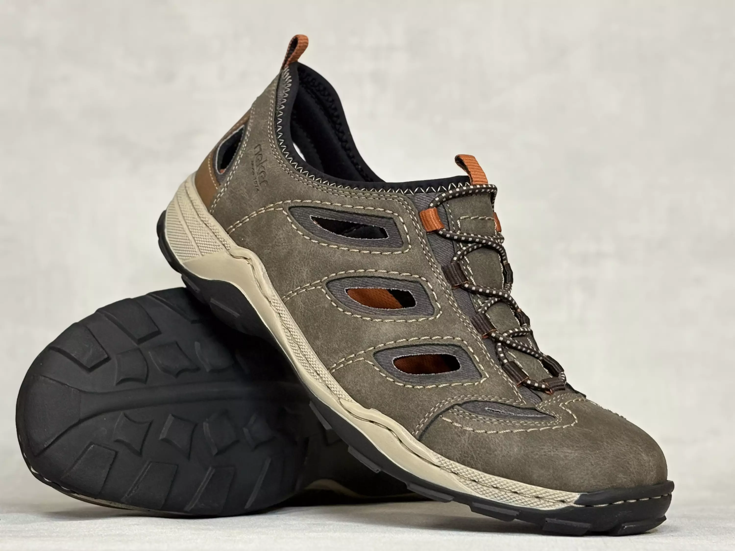 Ruskeat reikäkuvioidut Rieker kävelykengät. Aksenttivärinä harmaata, konjakinruskeaa ja ripaus murrettua oranssia. Koristeena ruskea-beiget venykenauhat, eivät ole siis säädettävissä. Kannan korkeus noin 3,5cm ja pohjan korkeus päkiän alta noin 1,5cm.