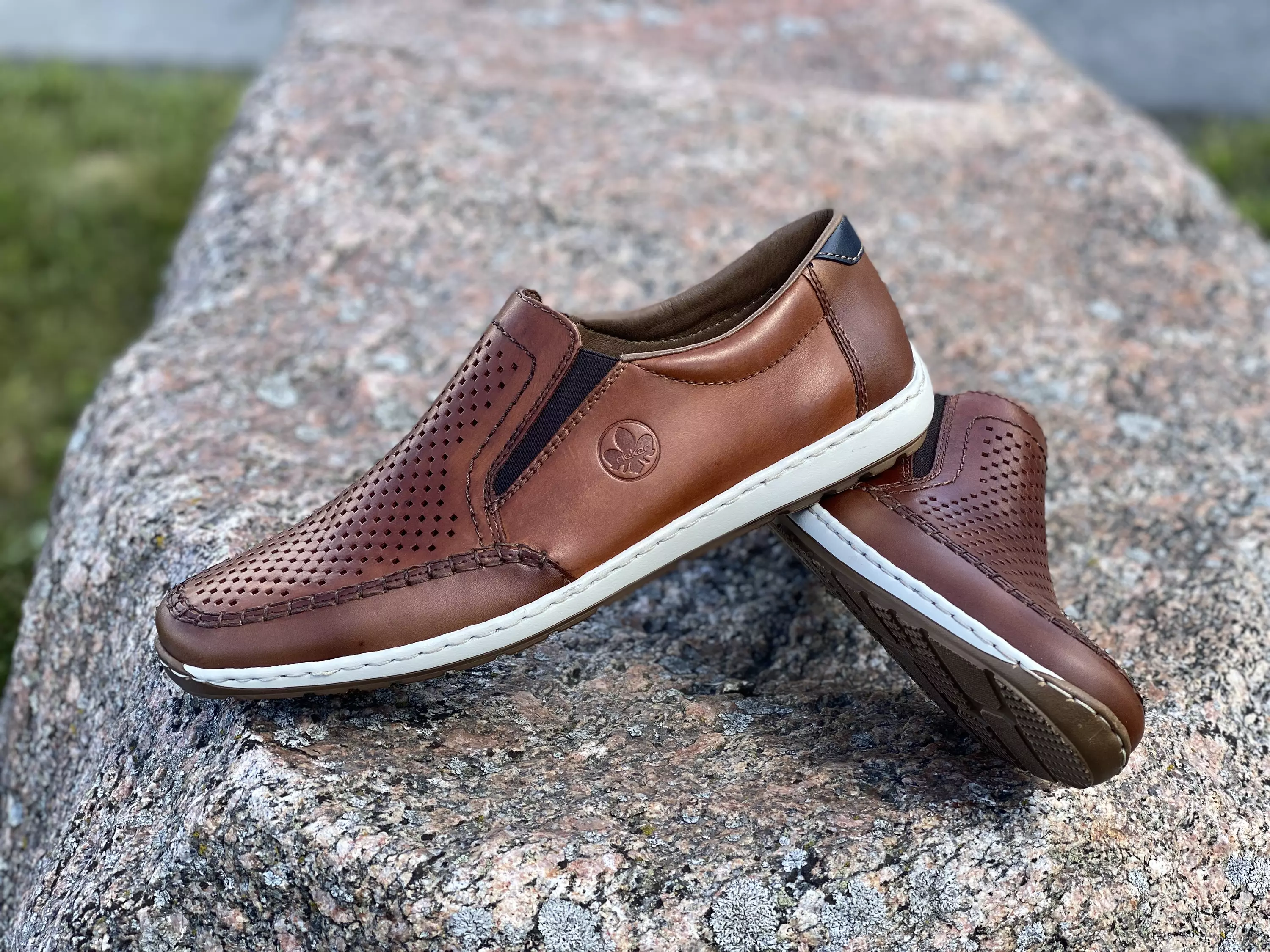 Konjakin ruskeat Rieker kävelykengät.Nahkaiset kävelykengät, joissa perferoitu nahkapinta. Reikäkuviot pitävät jalan ilmastoituna kesän lämmöissä. Nahkapintainen sisäpohja.