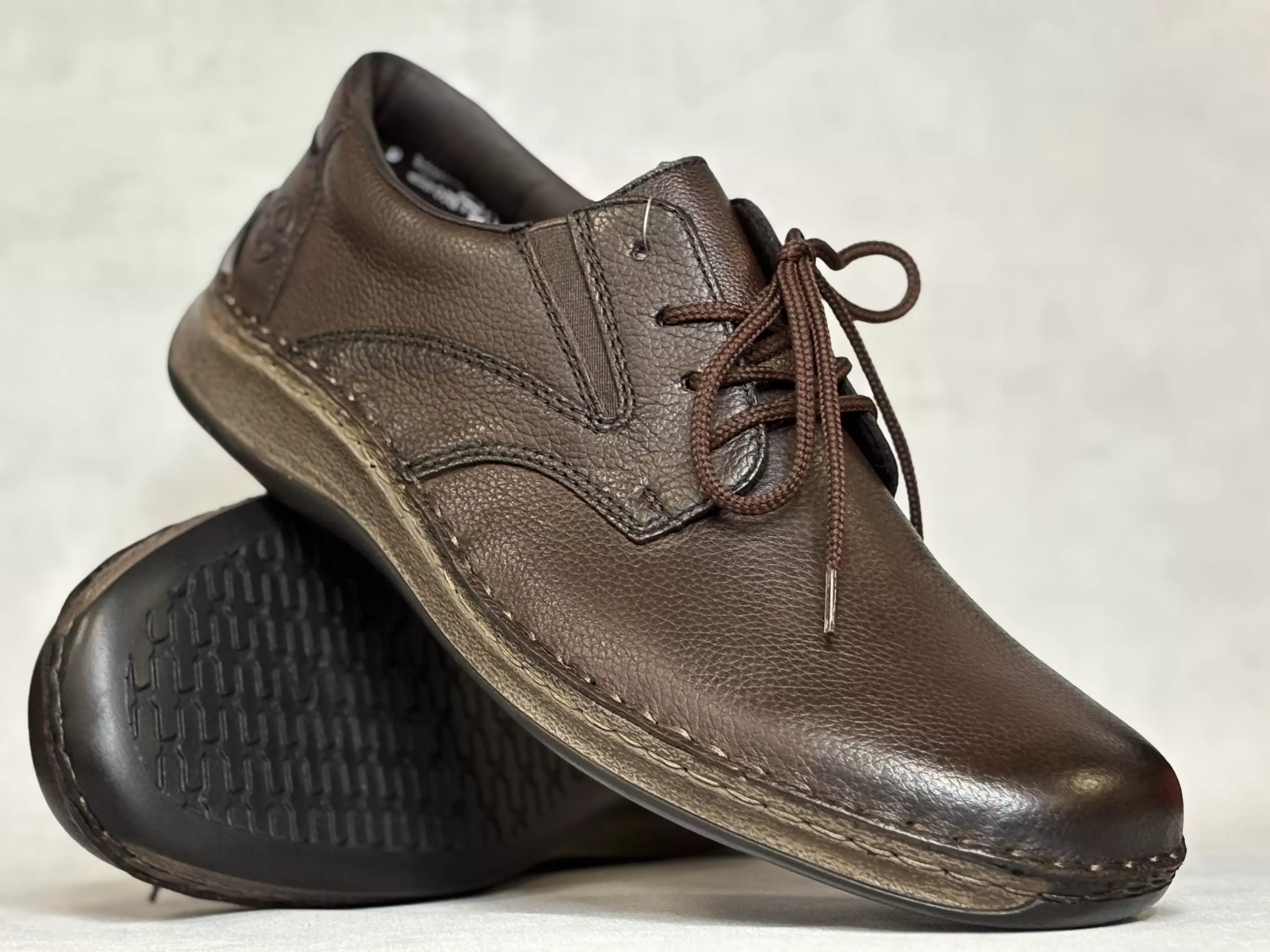 Tummanruskeat Rieker kävelykengät. Nauhoilla ja kahdella venykkeellä varustetut H-lestiset kävelykengät. Rieker metkitsee leveän lestinsä termillä Extra Wide. Kannan korkeus noin 3cm ja pohjan korkeus päkiän alta noin 1,5cm.