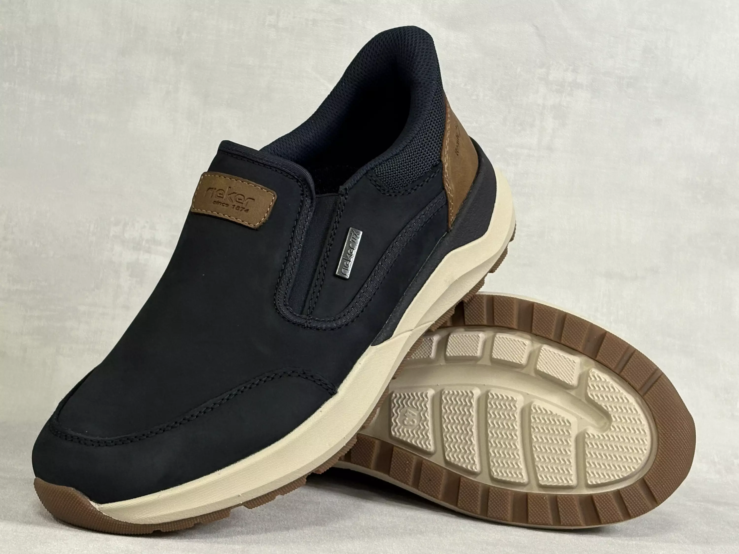 Tummasiniset Rieker kävelykengät. Ready2Go kenkälusikkakannalla varustetut kävelykengät sujahtavat vaivattomasti jalkaan. Sisä-ja ulkosyrjällä istuvuutta parantavat ja pukemista helpottavat venykkeet. Kannassa aksenttivärinä ruskea kappale, jonka yläreunassa Ready2Go-teksti. H-lestiset kävelykengät, Riekerin merkintä Extra wide. RiekerTex pitää tuulen tuiskeen ja kosteuden kenkien ulkopuolella. Rieker antristress pohjalliset ovat vaihdettavat, joten tarvittaessa sujautat kenkiin omia tarpeitasi parhaiten vastaavat pohjalliset. Kannan korkeus noin 4cm ja pohjan korkeus päkiän alta noin 2,5cm.