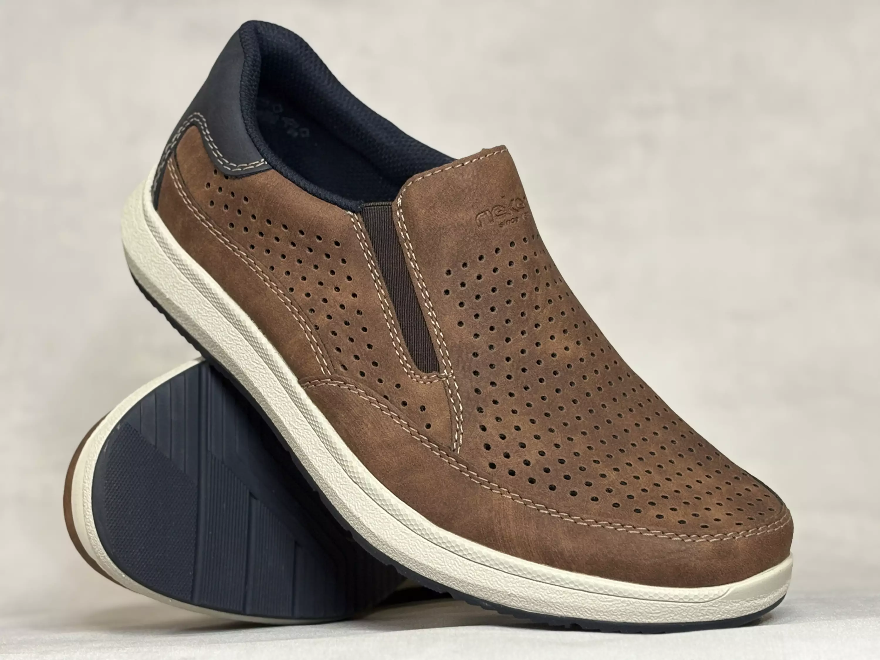 Ruskeat Rieker kävelykengät. Reikäkuvioitu kärki ja sivut, tummansininen kantakappale. Venykkeet helpottavat kenkien pukemista ja parantavat niiden istuvuutta. Vaihdettavat pohjalliset, joten tarvittaessa sujautat kenkiin omia tarpeitasi parhaiten vastaavat pohjalliset. Lestimitoitus leveähkö H. Kannan korkeus noin 3cm, pohjan korkeus päkiän alta noin 2cm.