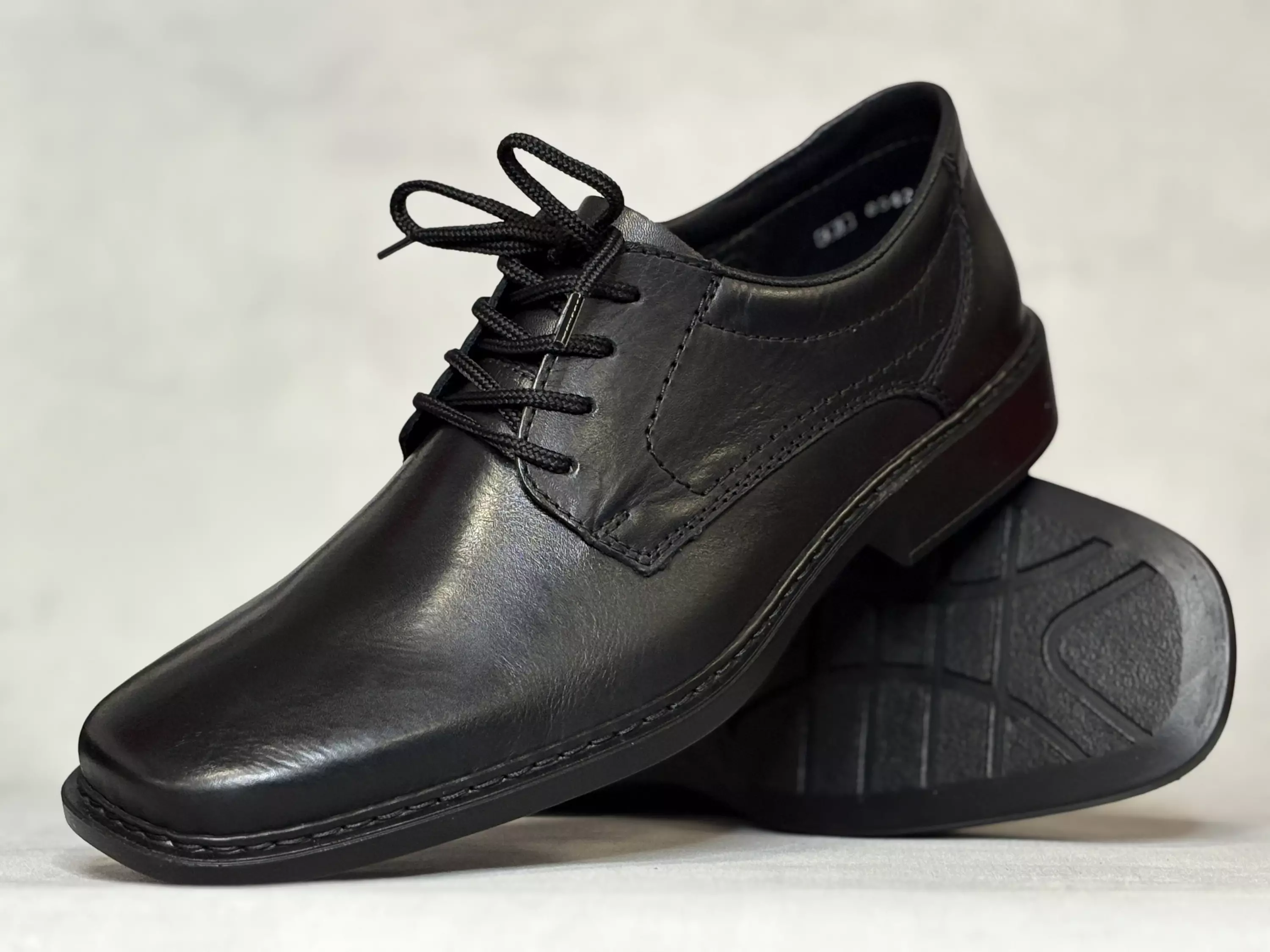 Mustat Rieker puolikengät. Nauhalliset pukukengät hillityillä leikkauksilla. Lestimitoitus Rieker Xtra Wide, eli leveähkö H-lesti. Kannan korkeus noin 3cm ja pohjan korkeus päkiän alta noin 1cm.