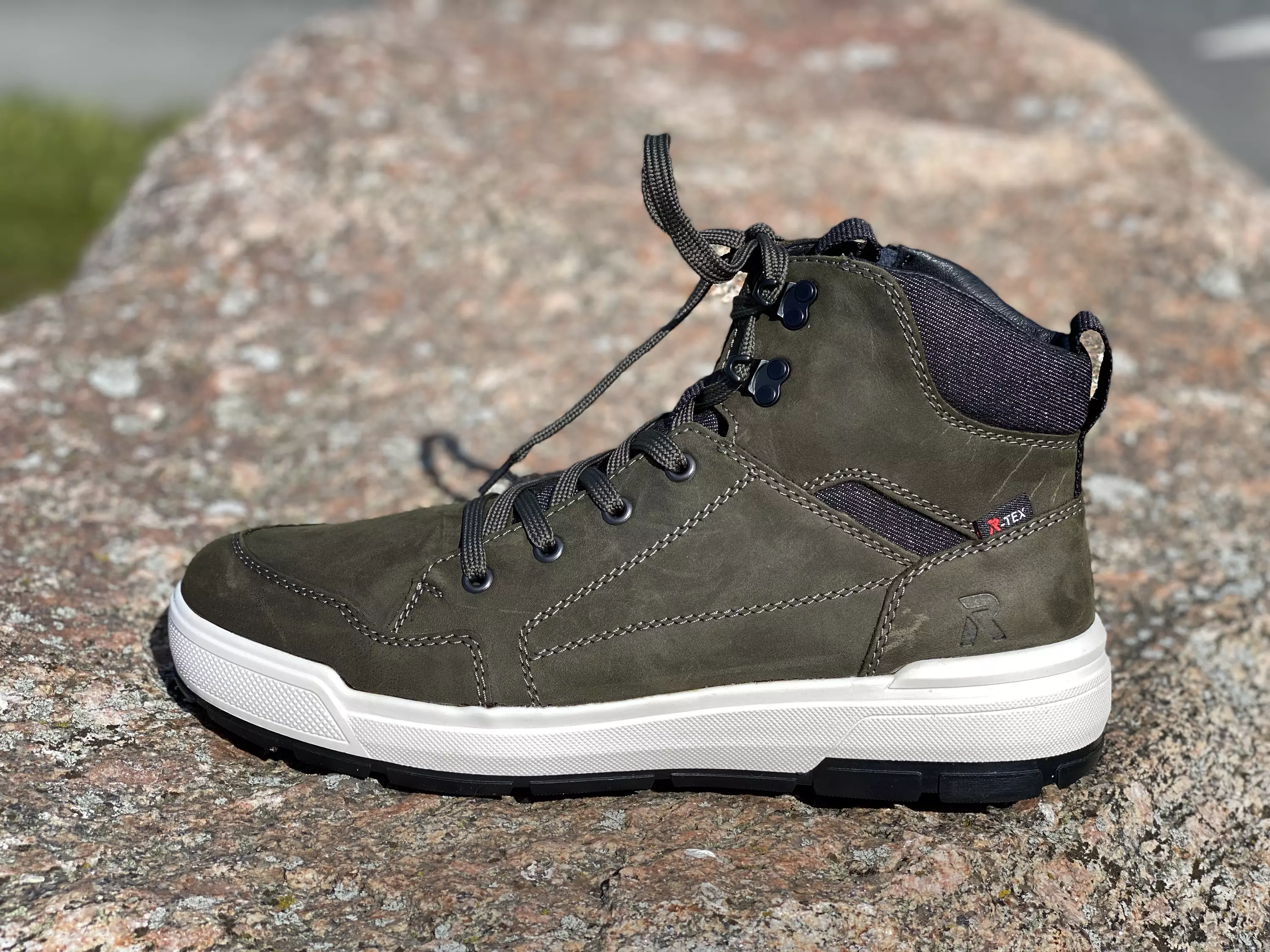 Tummanvihreät Rieker Revolution nilkkurit. Pinta on näyttävä yhdistelmä vihreää nahkaa ja tummanharmaata farkkua. Huopavuoriset korkeavartiset tennarit ovat mainio valinta vaihteleviin sääolosuhteisiin, varsinkin kun nämä Rieker Revolution jalkineet on varustettu myös R-Tex kalvolla. R-Tex teknologia tarjoaa kattavan suojan erilaisia sääolosuhteita vastaan - kosteuden, kylmän ja tuulen vaikutukset vähenevät! Samalla kengät hengittävät, joten ne tuntuvat jalassa edelleen miellyttäviltä. Pohjalliset ovat vaidhettavat, joten tarvitaessa sujautat niiden tilalle omia tarpeitasi parhaiten vastaavat pohjalliset. Kannan korkeus noin 4cm, pohjan korkeus päkiän alta noin 2,5cm.