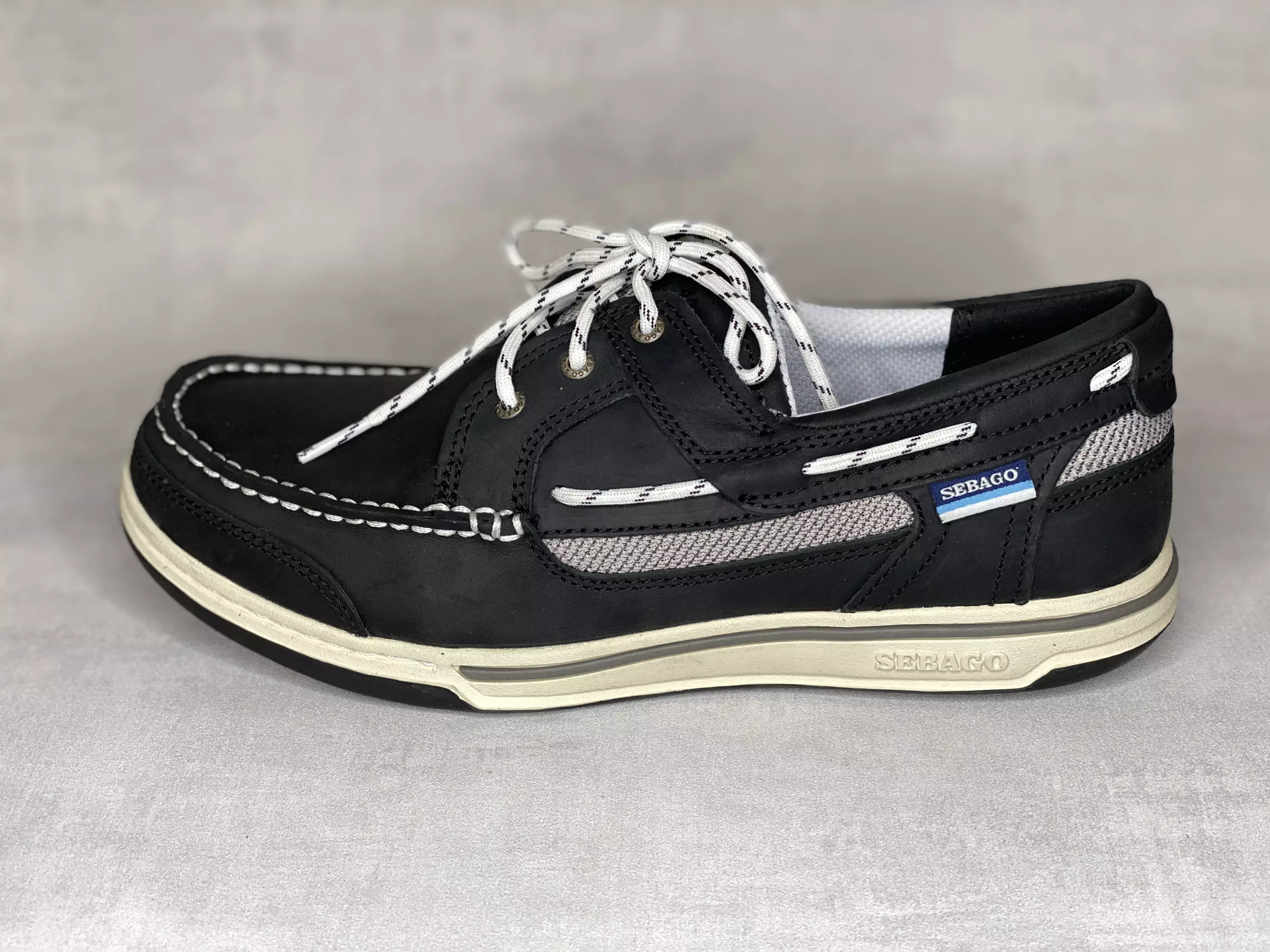 Mustat Sebago purjehduskengät. Nauhalliset kärjeltään mokkasiinimalliset purjehduskengät. Vaihdettavat pohjalliset, joiden tilalle sujautat tarpeen vaatiessa vaivattomasti omia tarpeitasi parhaiten vastaavat pohjalliset. Käsityönä valmistetut jalkineet tekstiilisellä vuorella. Liukumaton kumipohja, joka pitää hyvin kaikissa sääolosuhteissa jättämättä jälkiä.