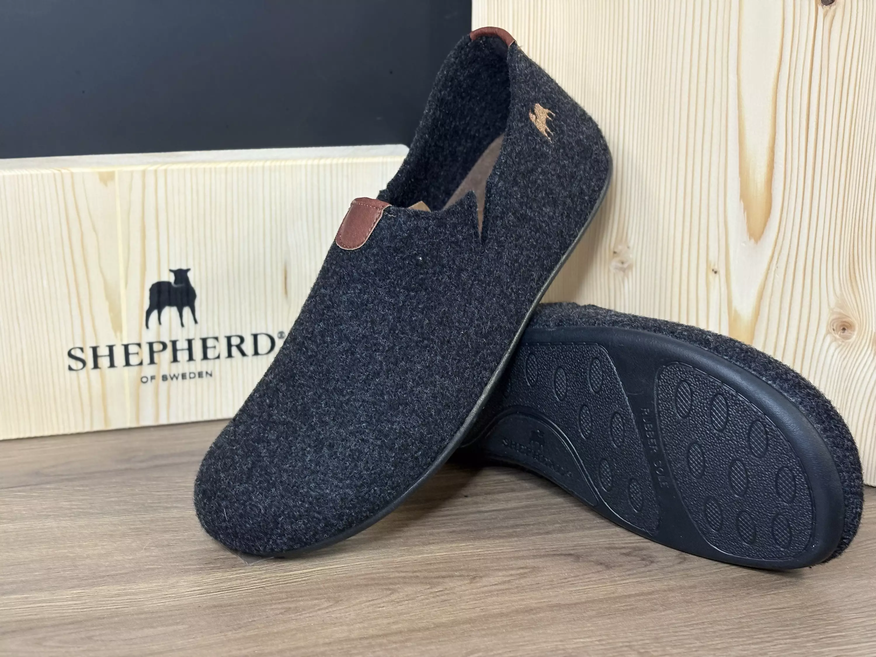 Tummanharmaat Shepherd of Sweden Ernst aamutossut. Huopaiset aamutossut, joiden ulkosyrjällä brodeerattu ruskea lammas. Vaihdettavat nahkapintaiset pohjalliset. Pohjallisen ollessa paikoillaan kannan korkeus noin 2cm. Ulkopohja on koko kengän mitalta noin 0,5cm paksu. Näihin aamutossuihin saa vapautettua leveyteen hieman lisätilaa vaihtamalla ohuemmat pohjalliset alkuperäisten tilalle.