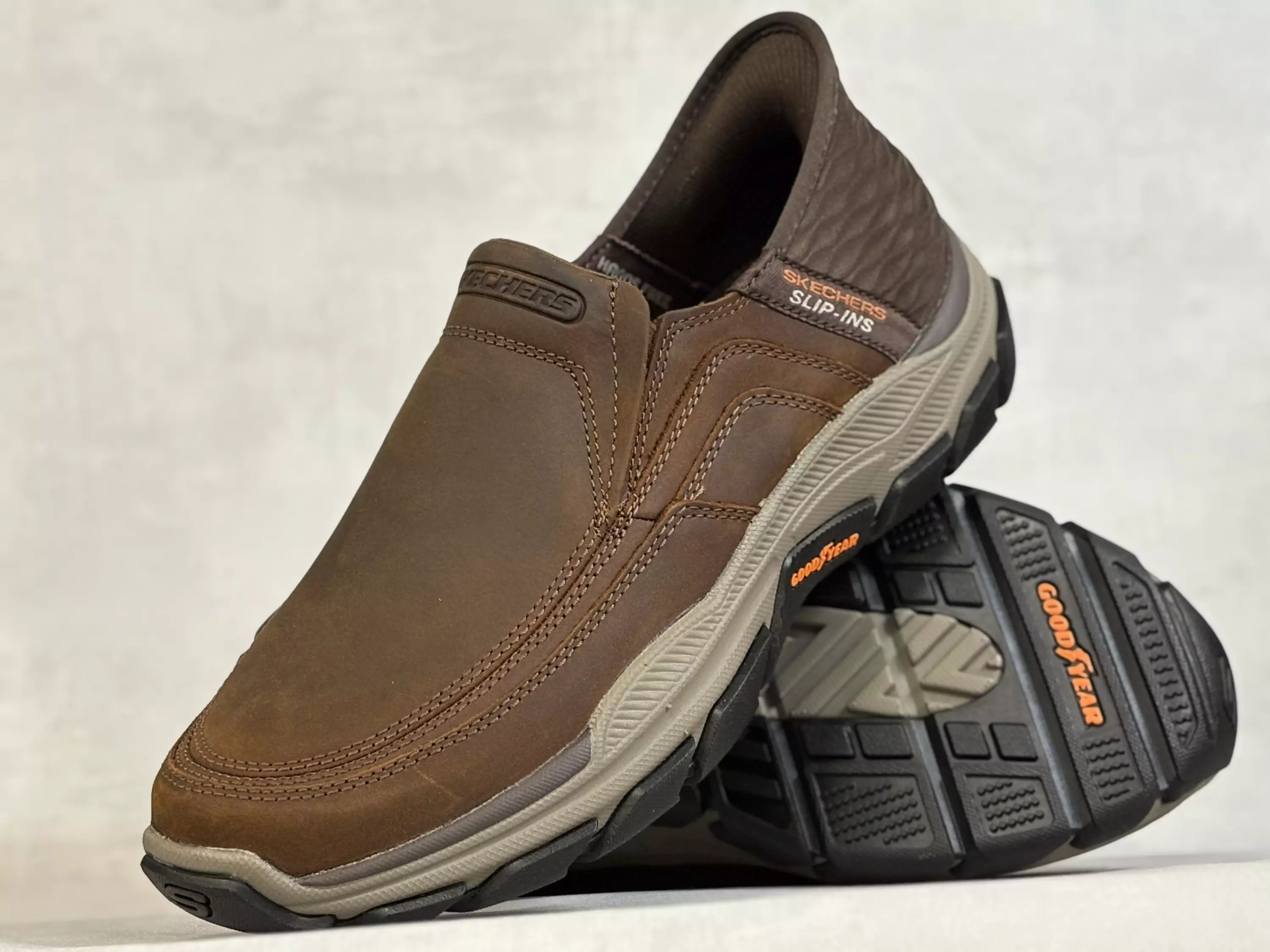 Ruskeat Skechers Respected - Elgin kävelykengät. Slip-ins kenkälusikkakannalla varustetut nahkaiset kävelykengät, joissa tekstiilinen kantakappale. Kengässä on kaksi pukemista helpottavaa ja istuvuutta parantavaa venykettä. Goodyear-kumipohjalla on korkea kulutuskestävyys ja se tarjoaa ylivoimaista pitoa erilaisissa sääolosuhteissa ja erilaisilla pinnoilla.