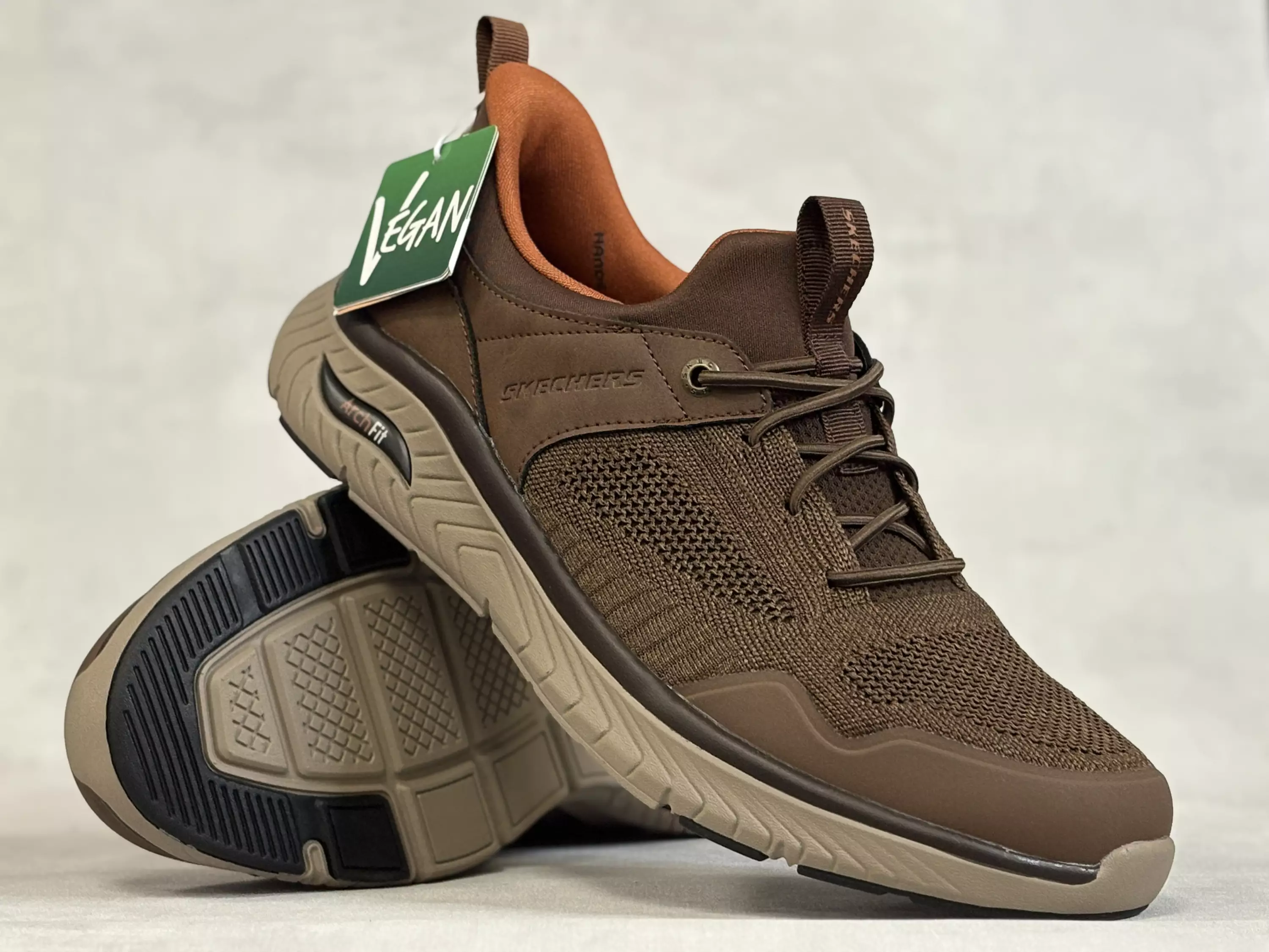 Ruskeat Skechers Arch Fit Crosser - Emeric lenkkarit. Slip-ins kenkälusikkakannalla varustetut lenkkarit. Kengän takaosassa olevassa lenkissä on pieni heijastava alue. Arch Fit holvikaarentuella varustetut pohjalliset ovat vaihdettavat, joten tarvittaessa vaihdat kenkiin omia tarpeitasi parhaiten vastaavat pohjalliset. Joustavat venykenauhat eivät ole säädettävissä. Kannan korkeus noin 3,5cm ja pohjan korkeus päkiän alta noin 2cm.Vegaaniset.