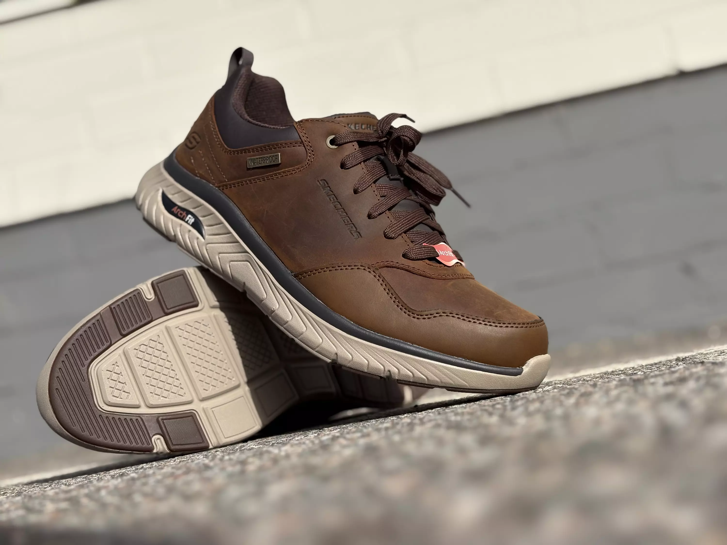Ruskeat Skechers Arch Fit Crosser - Ronaldo kävelykengät. Waerproof - Vedenpitävät! Arch Fit holvikaarentuella varustetut sisäpohjat. Nauhojen avulla kengät on helppo säätää omaan jalkaan sopivalle kireydelle. Pintamateriaali yhdistelmä nahkaa ja synteettistä materiaalia. Kannassa tekstiilinen vetolenkki. Skechers Relaxed Fit - Leveähkö lesti. Kannan korkeus noin 4cm, pohjan korkeus päkiän alta noin 2cm.