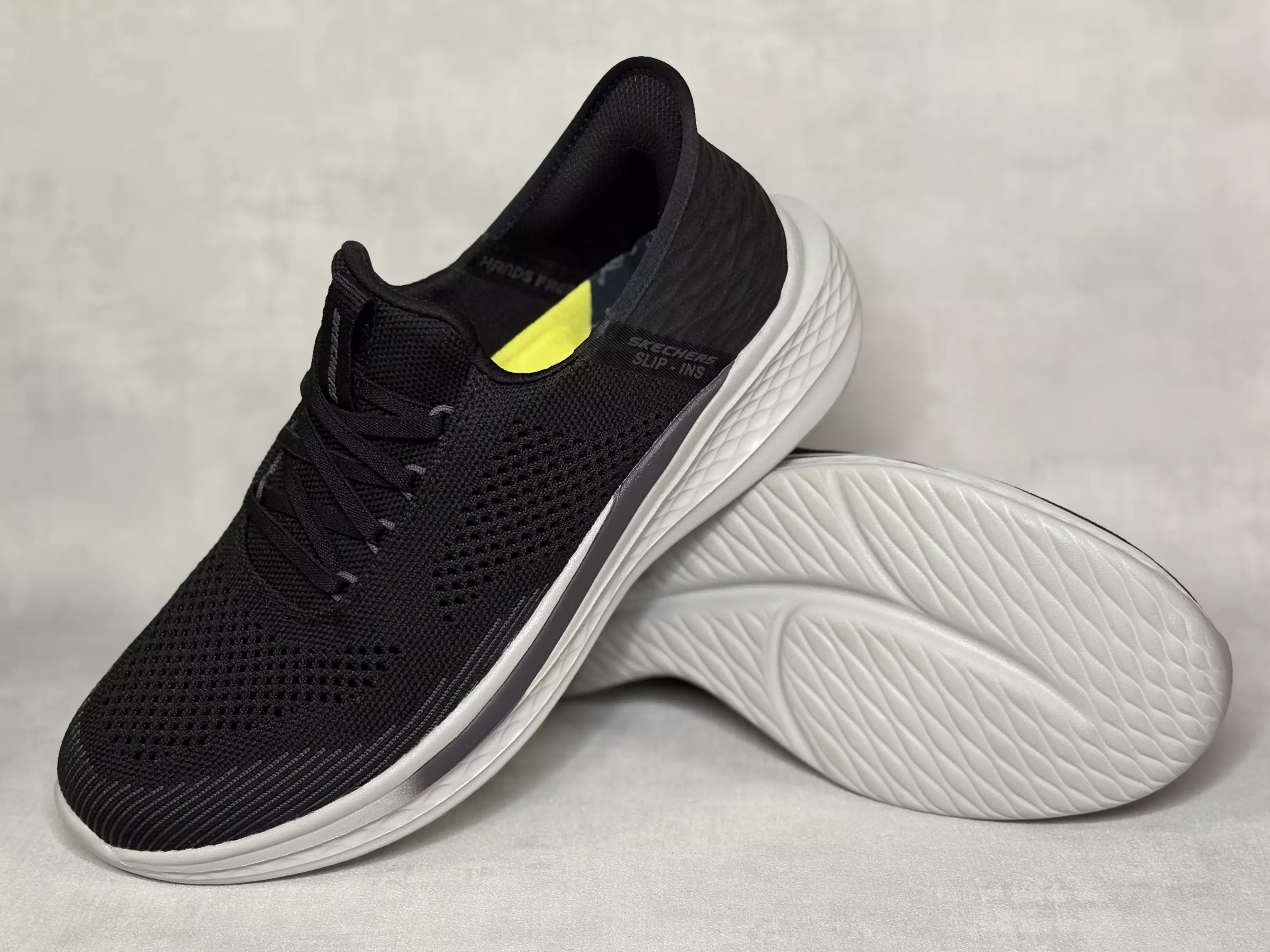 Mustat Skechers Slade - Quinto lenkkarit. Slip-ins kenkälusikkakannalla varustetut lenkkarit sujahtavat vaivattomasti jalkaan! Tekstiilinen reikäkuvioinen pinta, joten jalat ovat kengissä hyvin ilmastoidut. Pohjallinen on Skechersin Air Cooled Goga mat, jossa on tukea myös holvikaaren kohdalla. Mustat kiinteät venykenauhat (eivät ole säädettävät).