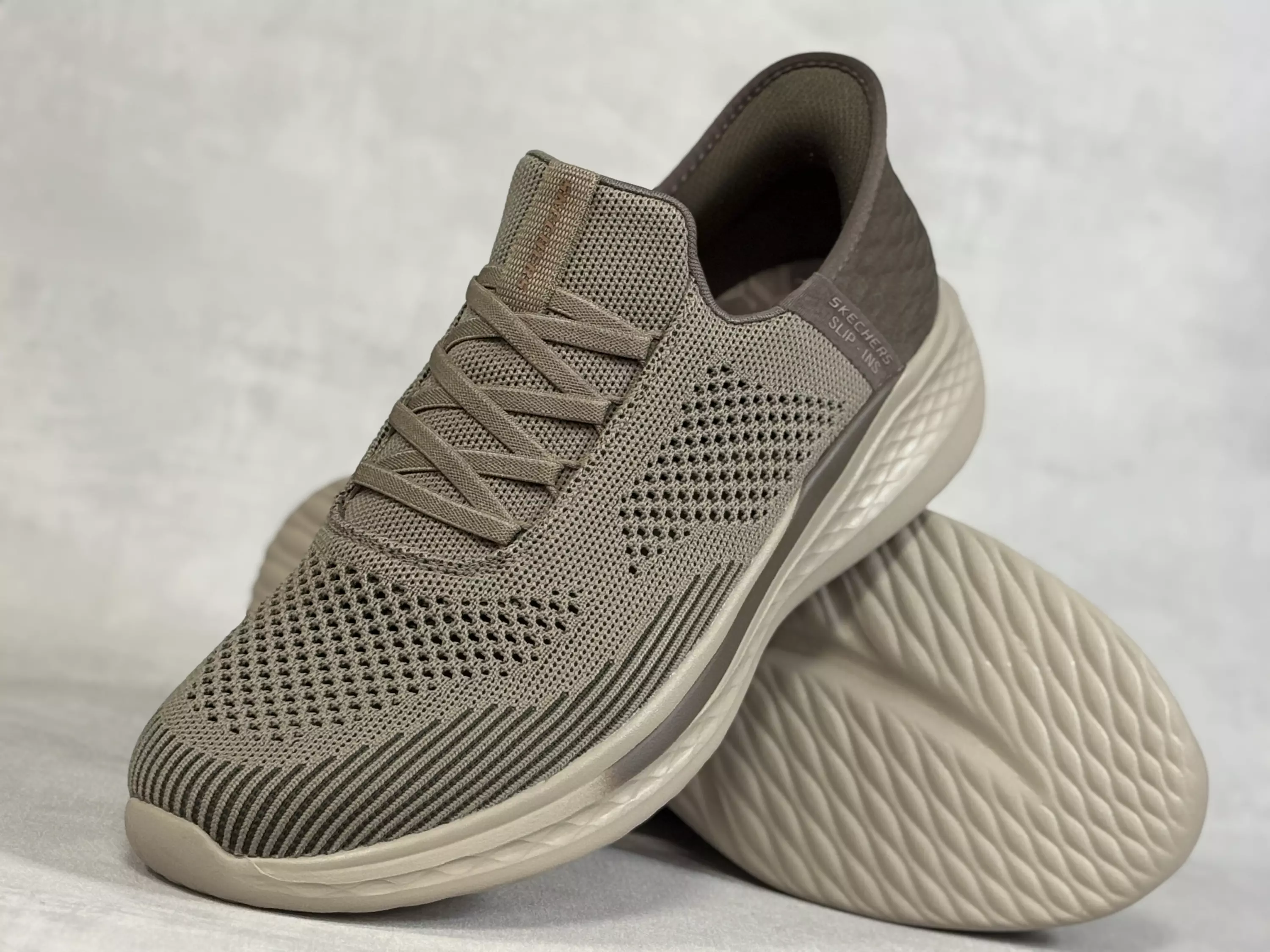 Khakin beiget Skechers Slade - Quinto Khaki lenkkarit. Slip-ins kenkälusikkakannalla varustetut lenkkarit sujahtavat vaivattomasti jalkaan! Tekstiilinen reikäkuvioinen pinta, joten jalat ovat kengissä hyvin ilmastoidut. Pohjallinen on Skechersin Air Cooled Goga mat, jossa on tukea myö sholvikaaren kohdalla. Khakin beiget venykeneuhat. Leveähkö Skechers Relaxed fit-lesti. Kannan korkeus noin 4cm ja pohjan korkeus päkiän alta noin 2cm.