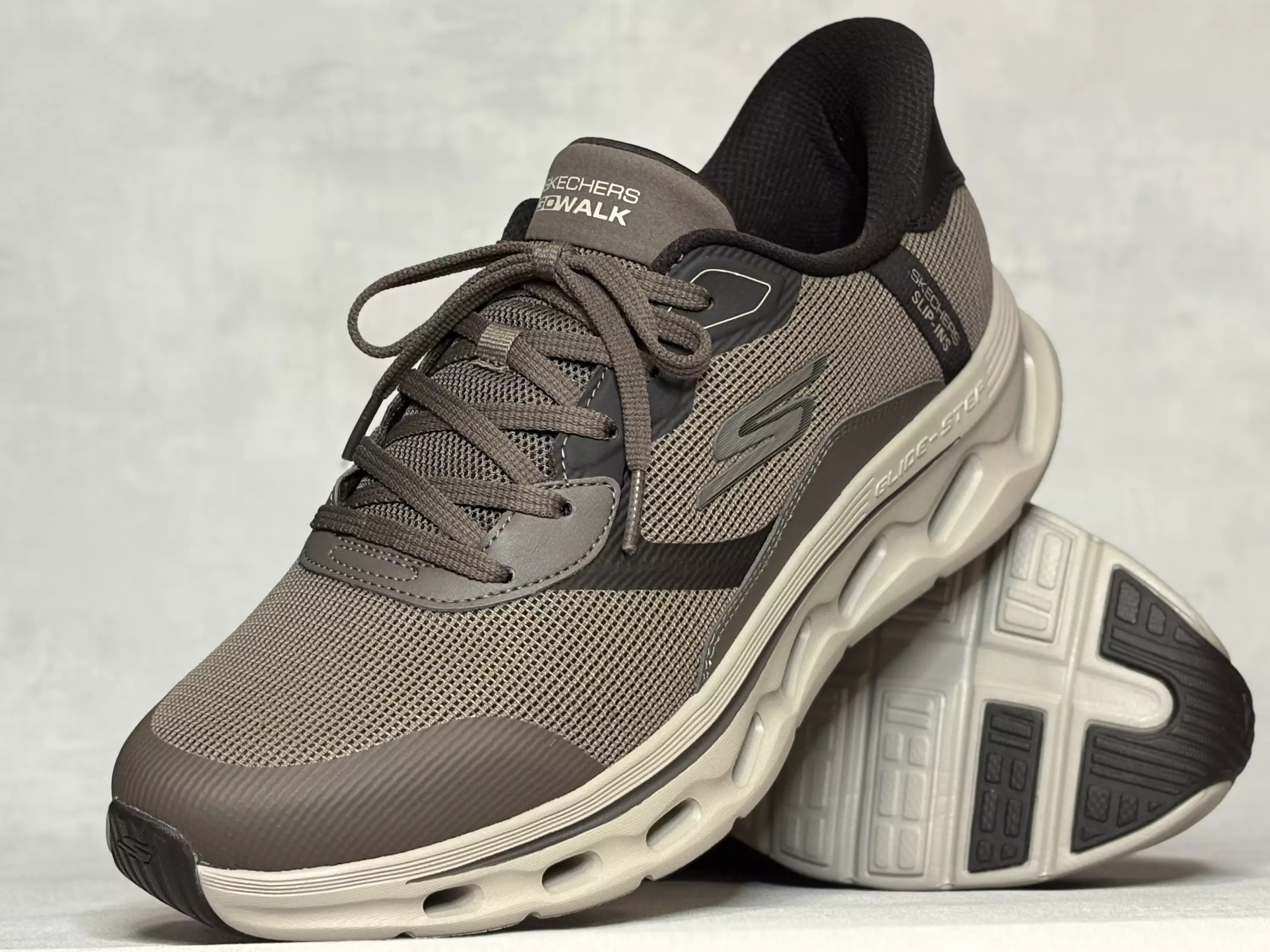Tummantaupet (harmaanruskeat) Skechers Go Walk Glide-Step 2.0 - Zac kävelykengät. Slip-ins kenkälusikkakannalla varustetut nauhalliset lenkkarit. Normaali lesti, Skechrs Classic Fit. Kannan korkeus noin 4,5cm ja pohjan korkeus päkiän alta noin 2,5cm.