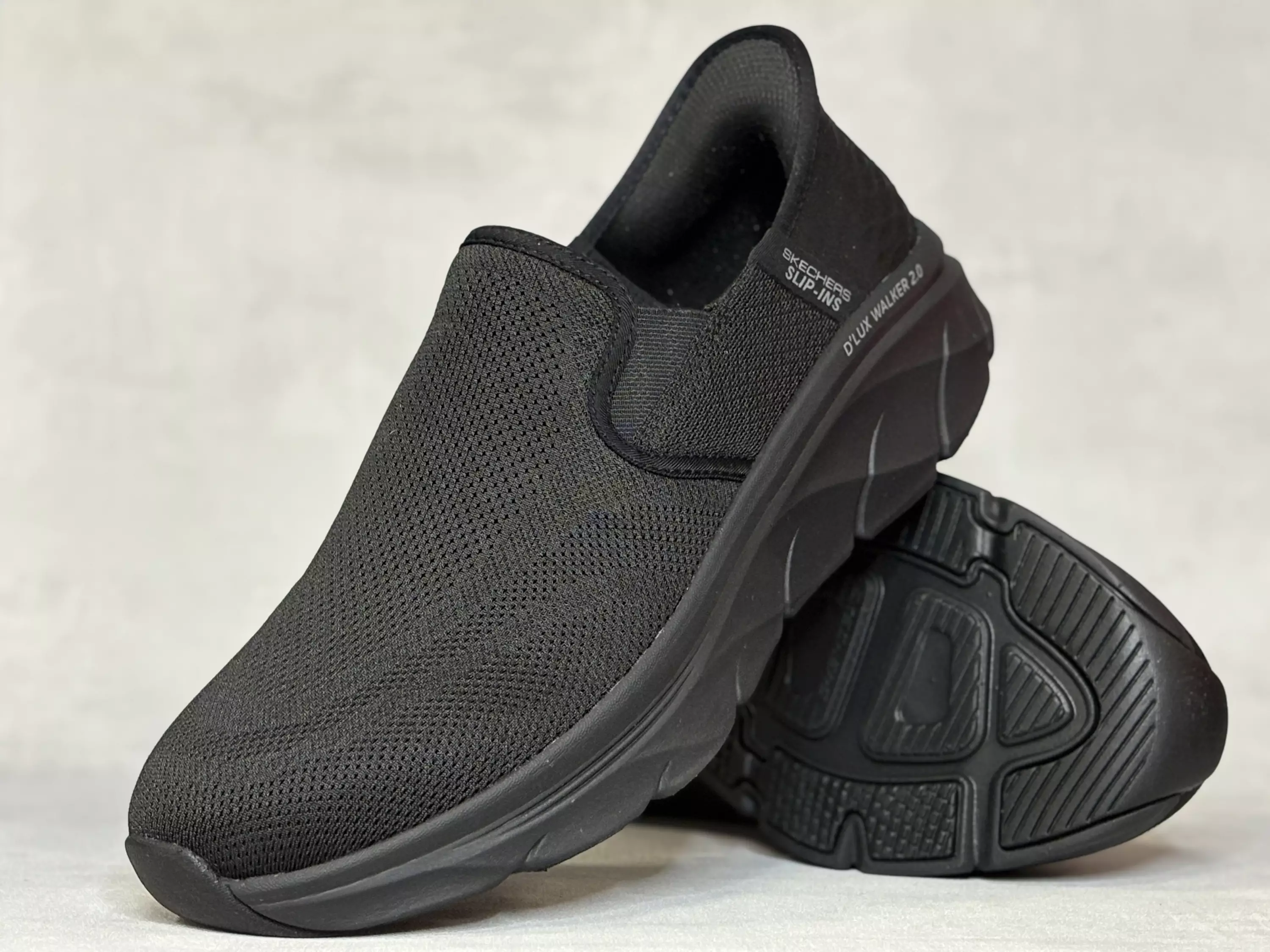 Mustat Skechers D'Lux Walker 2.0 - Reeler kävelykengät. Slip-ins kenkälusikkakannalla varustetut kävelykengät. Kengän venykkeet helpottavat pukemista ja parantavat istuvuutta. Lestimitoitus Skechers Relaxed Fit (Leveähkö lesti). Kannan korkeus noin 4,5cm ja pohjan korkeus päkiän alta noin 2,5cm.