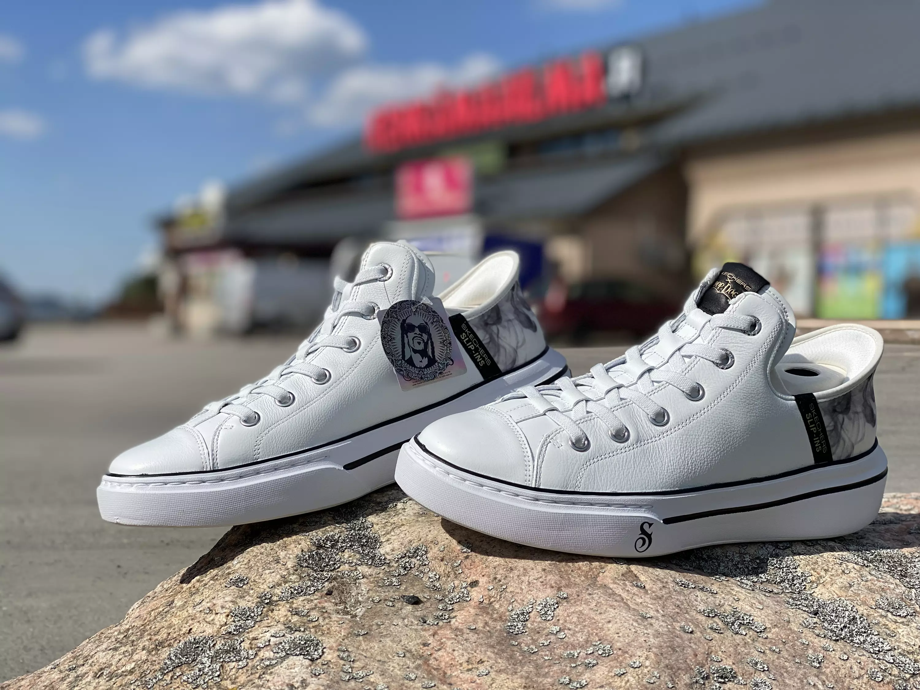 Valkoiset Skechers Snoop One - OG tennarit. Skechers Slip-ins kenkälusikkakanta, eli sen kun sujautat kengät jalkaan ja painat baanalle! Valkoiset venykenauhat. Valkoinen nahkapinta, tekstiilinen mustavalkoinen savukuvioinen kantakappale. Kanta on sisäpuolelta pehmustettu, joten kengät pysyvät mainiosti jalassa villimmässäkin menossa. Sisä- ja ulkosyrjällä musta tektiiliosio Skechers Slip-ins-tekstillä. Pehmeä jalkaan mukautuva sisäpohja.