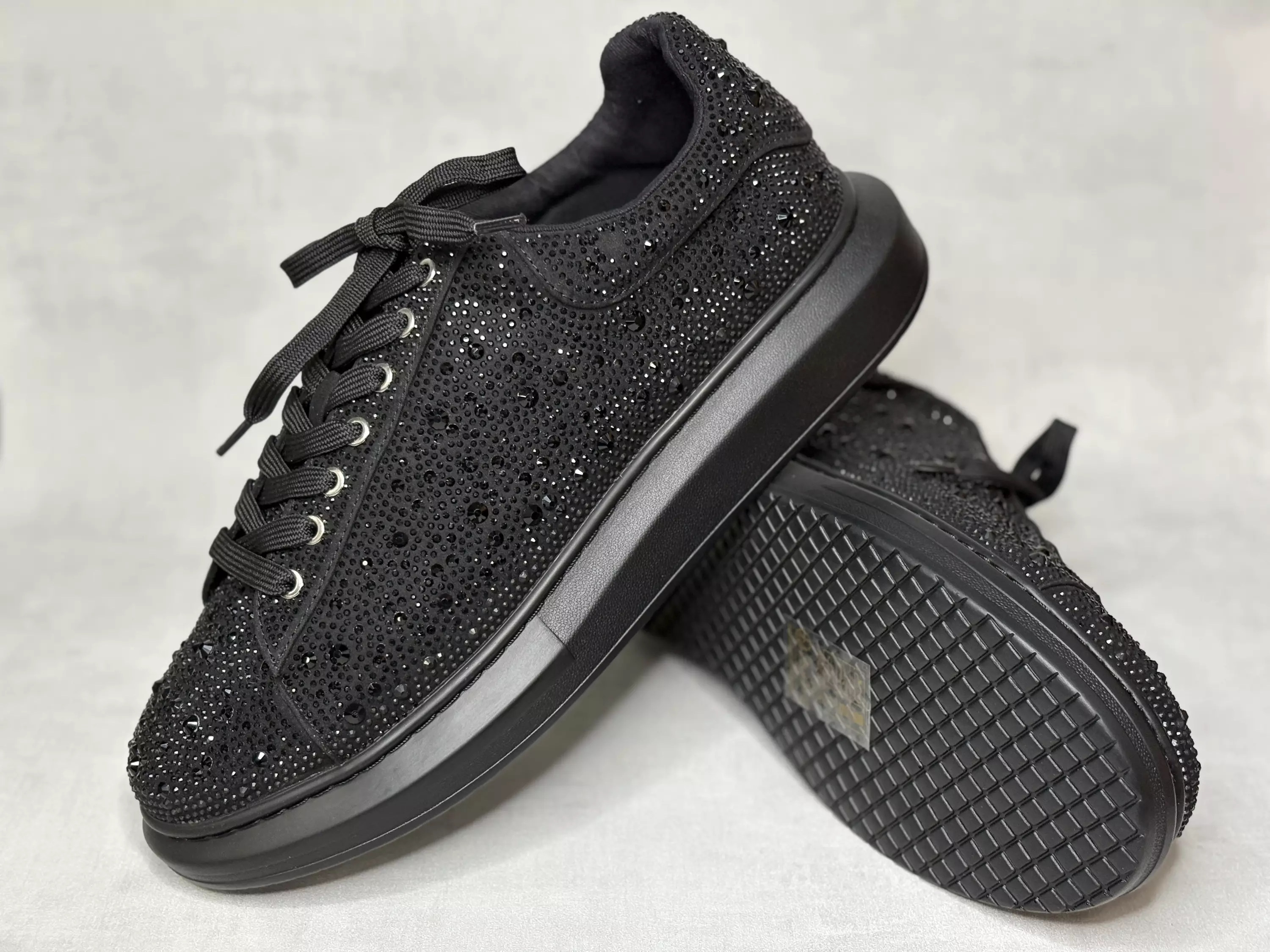 Mustat Steve Madden Icebox tennarit. Mustilla strasseilla koristetut näyttävät tennarit. Mustat nauhat, joiden avulla säädät kengät näppärästi omaan jalkaan sopiviksi. Pohjalliset ovat vaihdettavat, joten tarvittaessa vaihdat kenkiin omia tarpeitasi parhaiten vastaavat pohjalliset. Kannan korkeus noin 4cm ja pohjan korkeus päkiän alta noin 3cm.