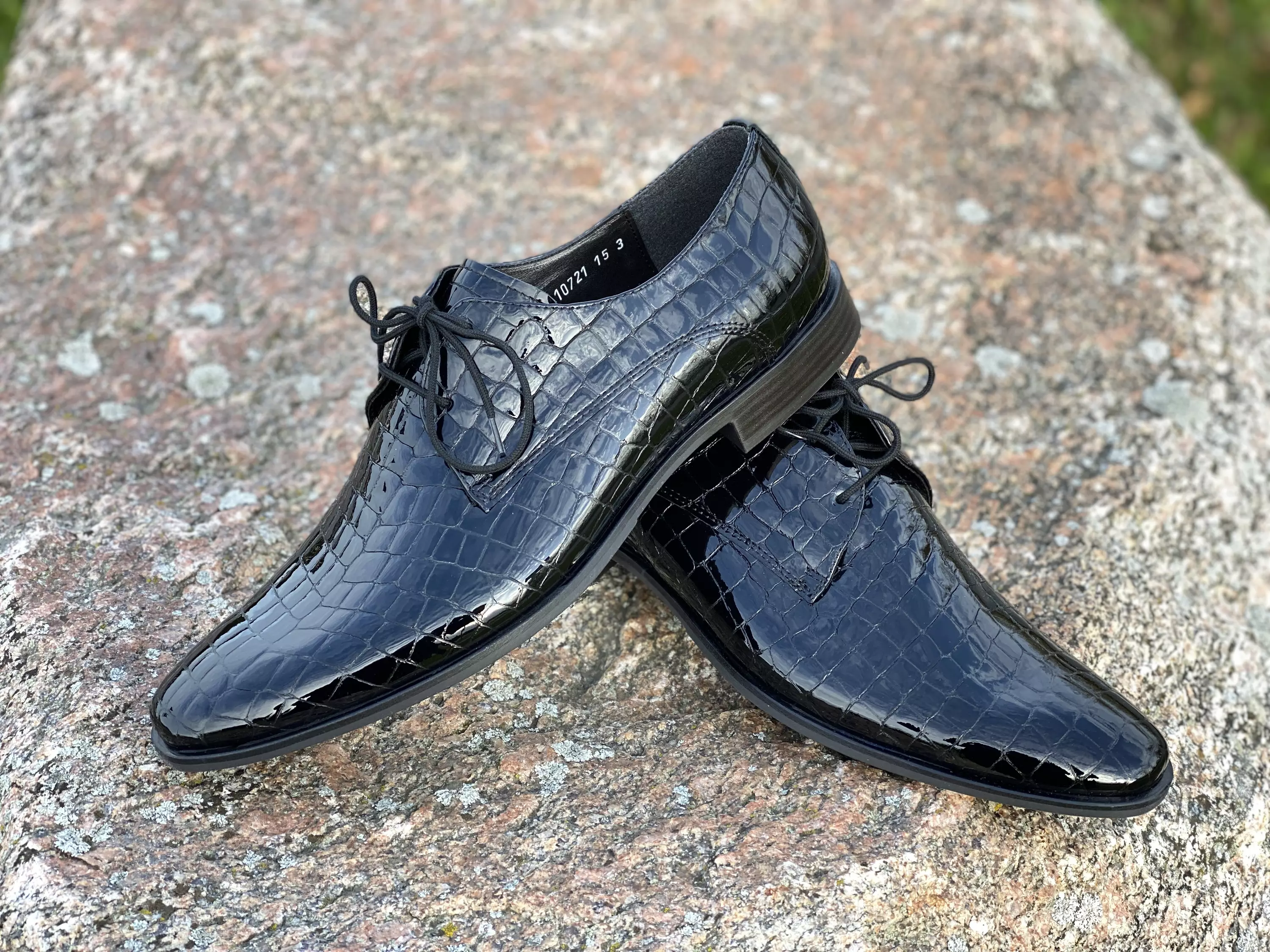 Mustat "kroko"lakerinahkaiset pukukengät ovat nappivalinta tyylitietoiselle juhlijalle. Pinnan muoto elää valon ja valaistuksen mukaan. Nämä kengät jalassa et takuulla jää huomiotta! Topman lesti istuu leveämpäänkin jalkaan mainiosti. Topman puolikenkä on suhteellisen reilua kokoa joten tästä on useimmiten valittu yksi koko pienempää mitä normaalisti käytetään.