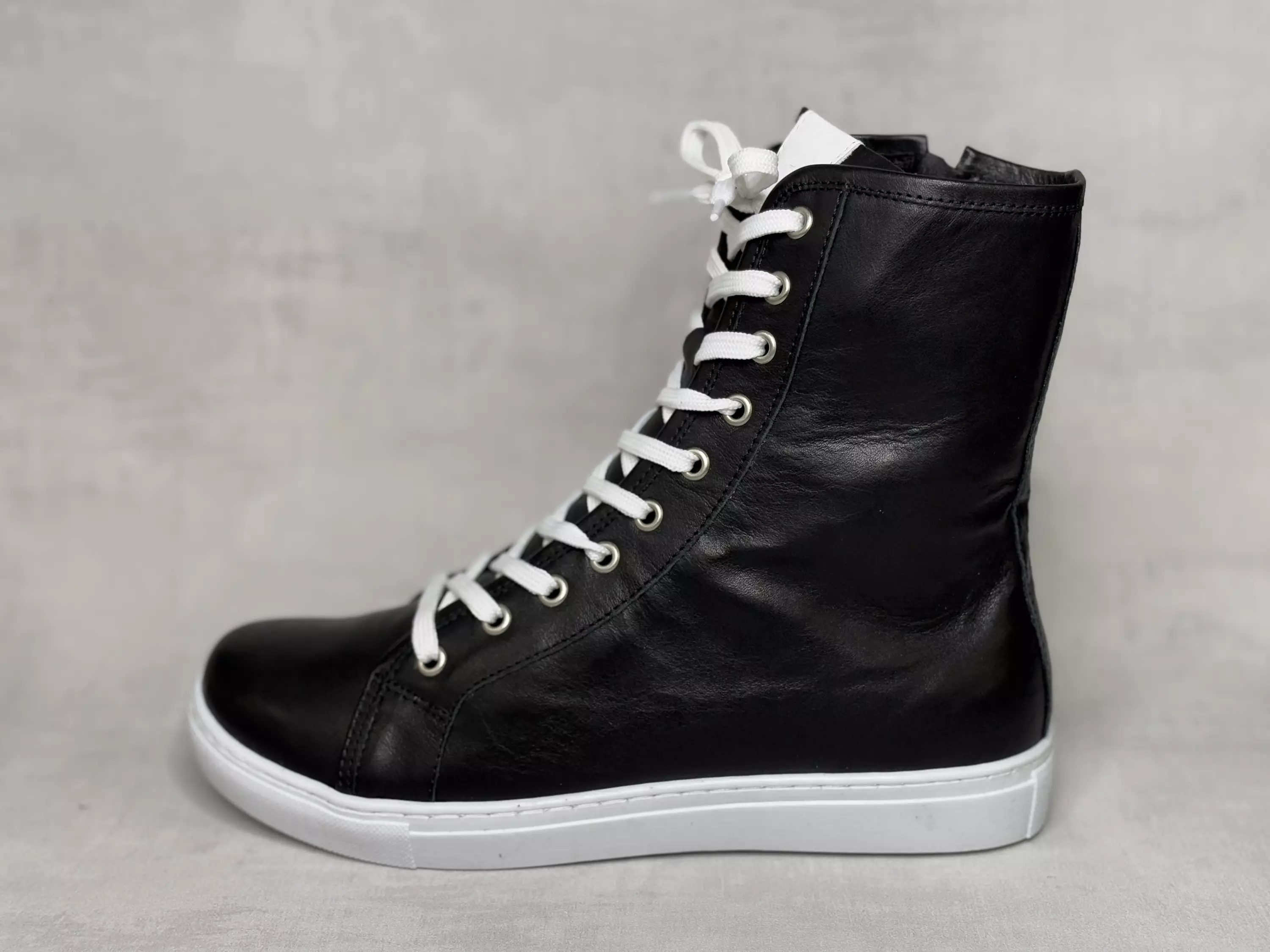 Mustat Andrea Conti nahkatennarit, joissa iltin yläosassa keskellä valkoinen AC-merkki. Korkeavartiset nauhalliset tennarit. Sisäsyrjällä pukemista helpottava vetoketju. Pehmeät nahkapintaiset pohjalliset ovat vaihdettavat, joten tarpeen vaatiessa sujautat näihin tennareihin omia tarpeitasi parhaiten vastaavat pohjalliset.