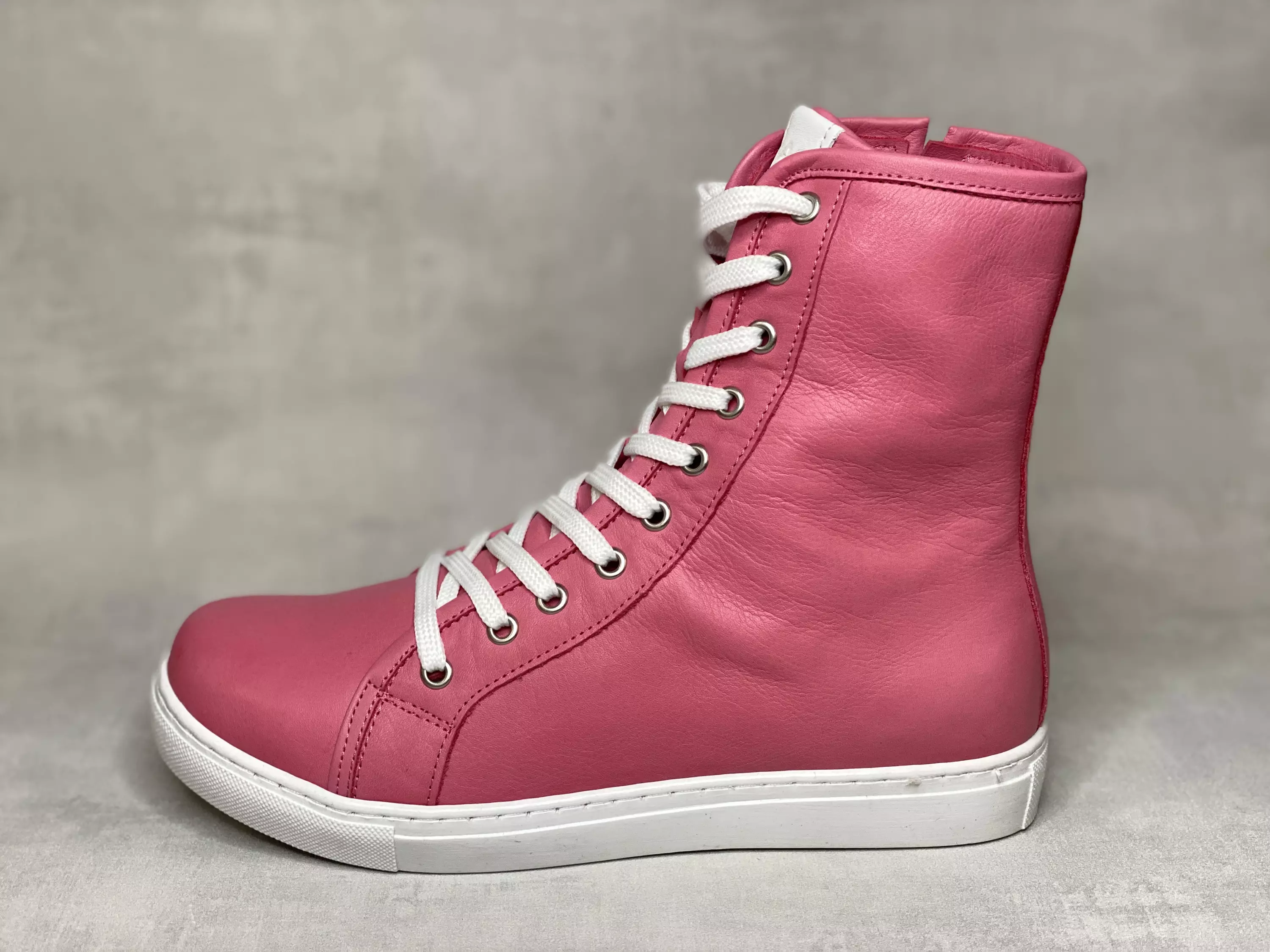 Pinkit Andrea Conti nahkatennarit, joissa iltin yläosassa keskellä valkoinen AC-merkki. Korkeavartiset nauhalliset tennarit ovat mainio valinta kesään! Sisäsyrjällä pukemista helpottava vetoketju. Pehmeät nahkapintaiset pohjalliset ovat vaihdettavat, joten tarpeen vaatiessa sujautat näihin tennareihin omia tarpeitasi parhaiten vastaavat pohjalliset. Valkoiset nauhat ja valkoinen ulkopohja. Nauhoituksen sirkkarenkaat ovat metallinharmaat.