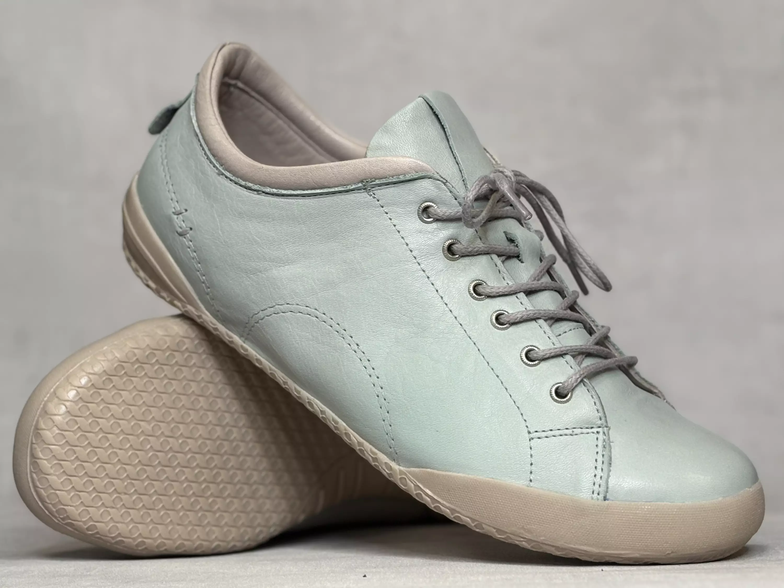 Vaaleanvihreät Andrea Conti 1733 nahkatennarit. Ihanan pehmeät nahkaiset kävelykengät. Merellinen vaaleanvihreä ulkopinta luo kauniin kokonaisuuden pohjan ja sisävuoren hiekanharmaan kanssa. Reiluhkon lestin ja nauhojen avulla kengät saa helposti omaan jalkaan sopiviksi. Vaihdettavat nahkapintaiset pohjalliset, joten tarvitaessa sujautat kenkiin omia tarpeitasi parhaiten vastaavat pohjalliset. Lestimitoitukseltaan nämä kengät ovat leveähköt "H" ja kärki on muodoltaan pyöreä. Kannan korkeus noin 2,0cm ja pohjan korkeus päkiän alta noin 1,5cm.