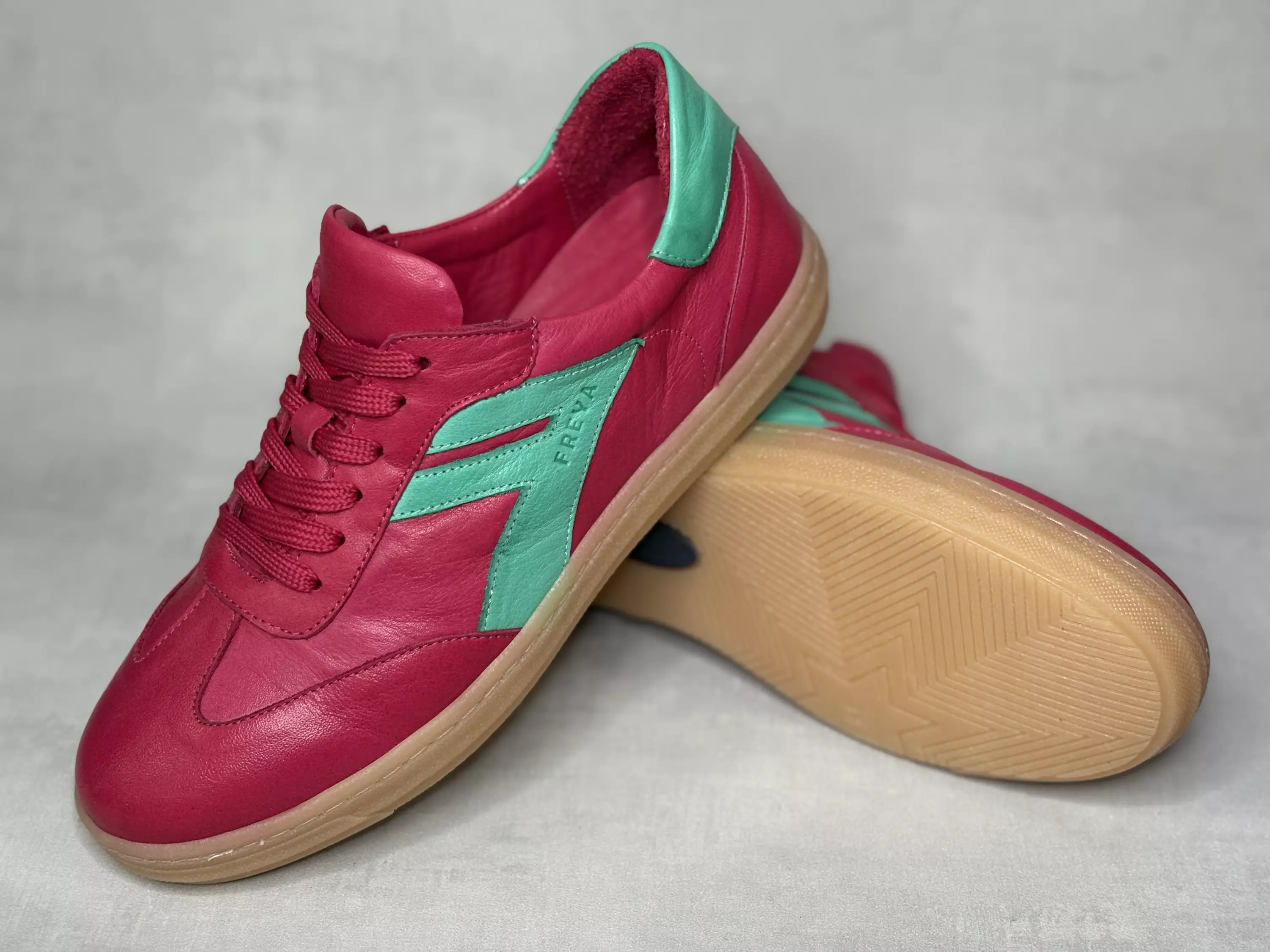 Pinkit Andrea Conti Freya tennarit. Nämä pirteät nahkatennarit ovat suorastaan mainio valinta arkea ilahduttamaan! Mintunvihreät yksityiskohdat täydentävät kenkien ilmettä, tehden väriyhdistelmäst veikeän retron. Nauhojen avulla kengät on helppo säätää omaan jalkaan sopiviksi. Nahkapintaiset pohjalliset ovat vaihdettavat, joten tarvittaessa sujautat kenkin omia tarpeitasi parhaiten palvelevat pohjalliset. Kannan korkeus noin 2,5cm ja pohjan korkeus päkiän alta noin 2cm.
