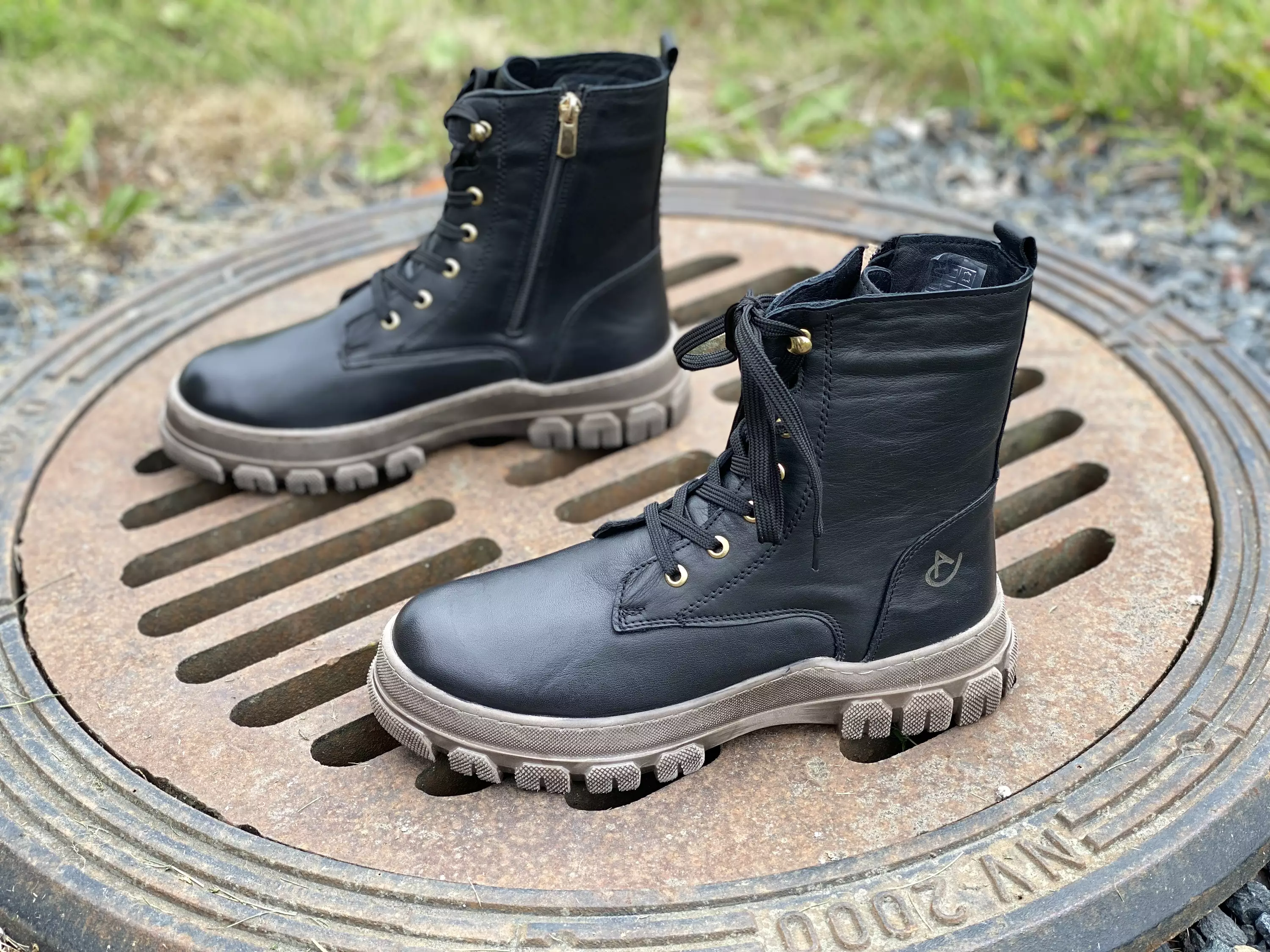 Mustat Andea Conti maiharit. Paksupohjaiset maiharit ilmeikkäällä ulkopohjalla. Pehmeät nahkamaiharit säätyvät omaan jalkaan sopiviksi nauhoituksen avulla ja sisäsyrjälle sijoitettu vetoketju helpottaa pukemista. Maihareissa on kullanväriset sirkkarenkaat sekä vetoketjun vedin. Vaihdettavat pohjalliset, joten tarvittaessa vaihdat kenkiin omia tarpeitasi parhaiten vastaavat pohjalliset.