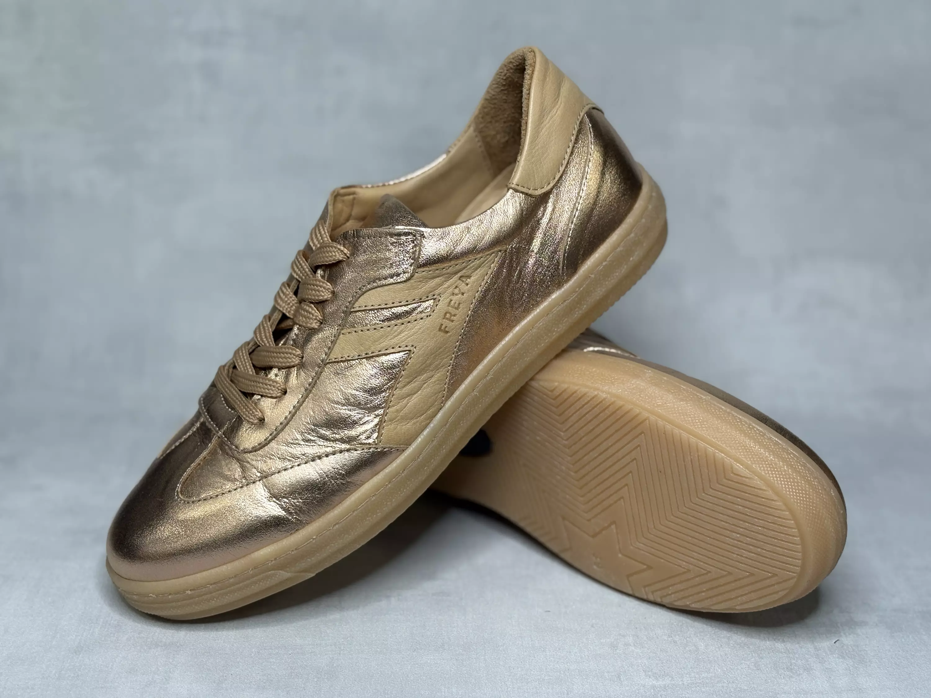 Ruusukultaiset Andrea Conti Freya tennarit. Metallinhohtoiset ruusukultaiset nahkatennarit ovat suorastaan säihkyvä valinta arkea piristämään! Vaaleanruskeat yksityiskohdat täydentävät kenkien ilmettä. Nauhojen avulla kengät on helppo säätää omaan jalkaan sopiviksi. Nahkapintaiset pohjalliset ovat vaihdettavat, joten tarvittaessa sujautat kenkin omia tarpeitasi parhaiten palvelevat pohjalliset. Kannan korkeus noin 2,5cm ja pohjan korkeus päkiän alta noin 2cm.