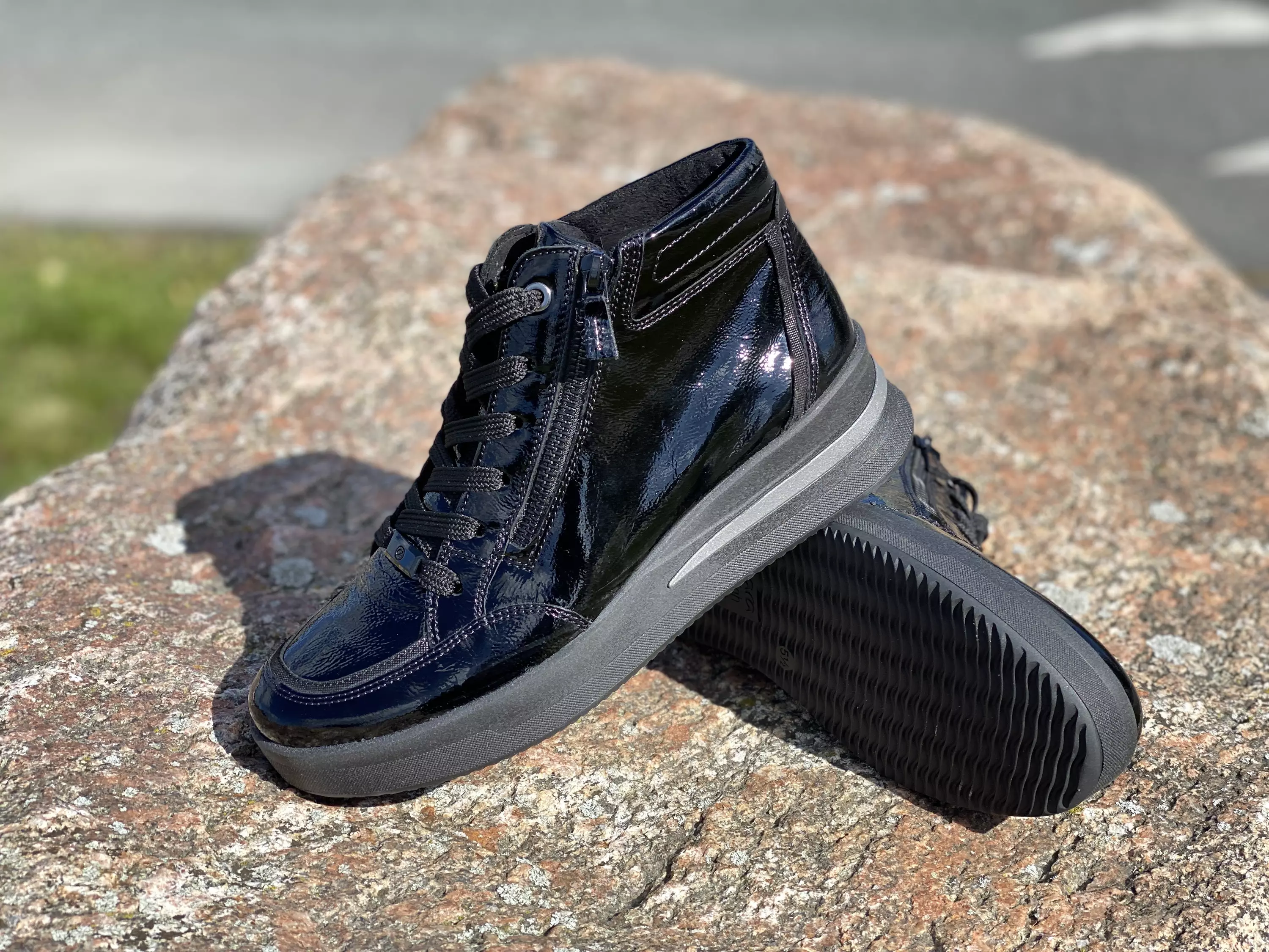 Mustat Ara tennarit. Korkeavartiset lakerinahkaiset tennarit ovat kaiken huikeiden päälle myös kiilapohjaiset! Nauhoituksen molemmilla puolilla on vetoketju, joista avaat tarvittaessa molemmat pukemista helpottamaan. Nauhojen avulla säädät kengät helposti omaan jalkaan sopiviksi. Kannan korkeus noin 4,5cm, pohja edestä 2,5cm. Varren korkeus koossa 5,5 noin 8cm.