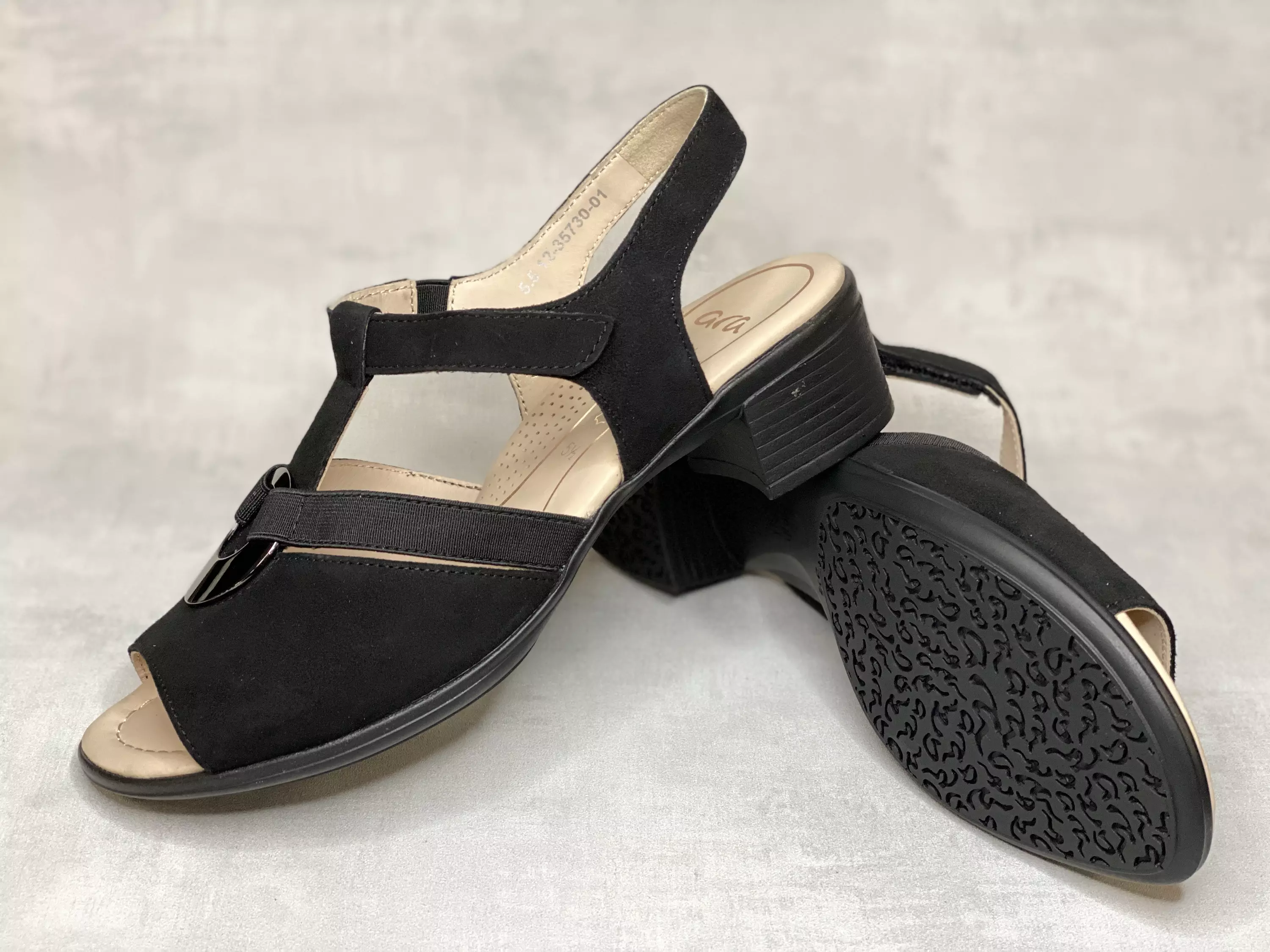 Mustat Ara H sandaalit. Matalakorkoiset nahkasandaalit on varustettu tarrasäätöisellä remmillä, jonka sisäsyrjällä on pieni istuvuutta parantava venyke. Pehmeä Ara High soft-sisäpohja. Metallinen kärkikoru antaa sandaalille ilmettä. Kannan korkeus noin 5cm ja pohjan korkeus päkiän alta noin 1cm.