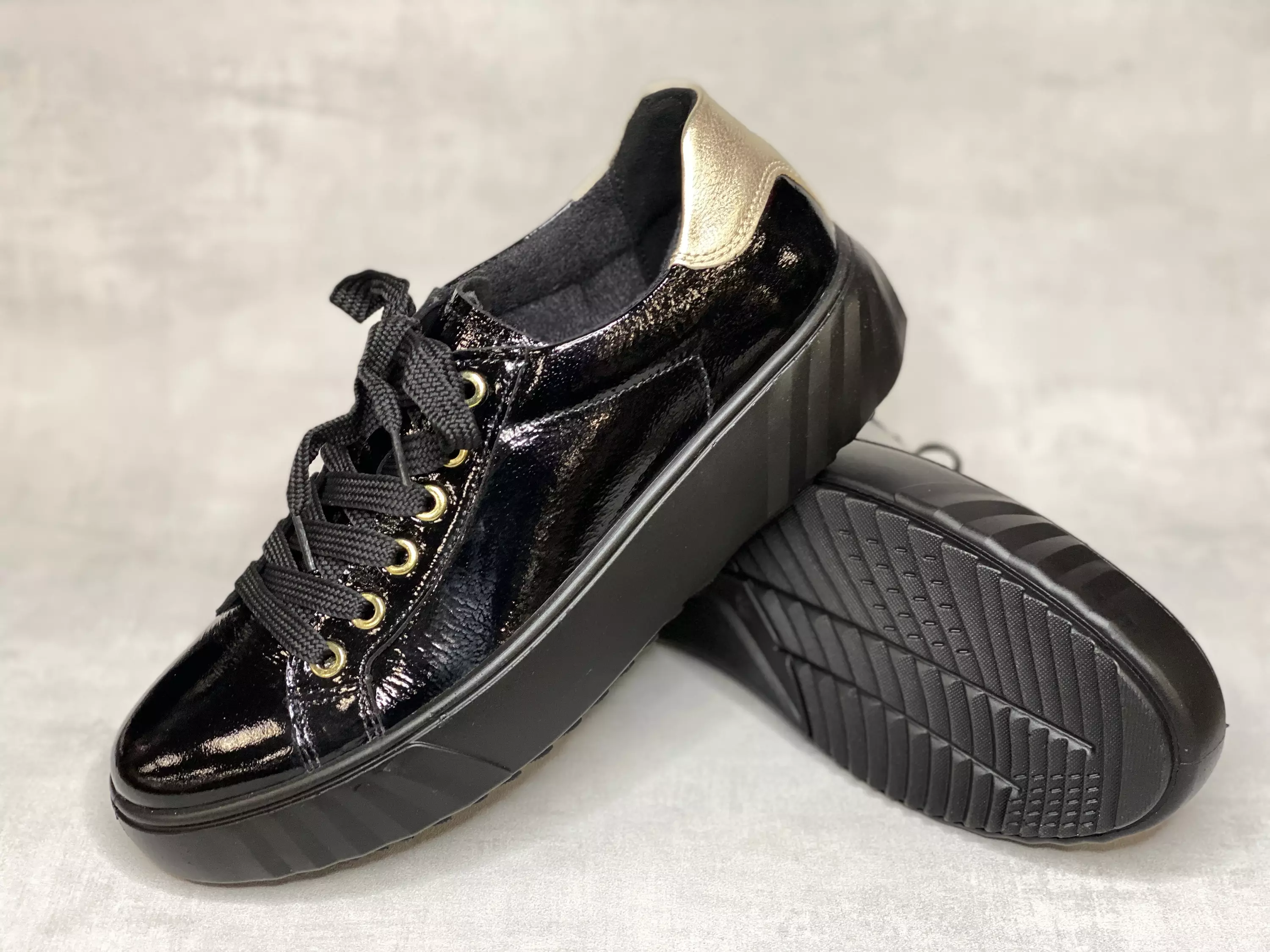 Mustat Ara Monaco tennarit. Nauhalliset lakerinahkaise kävelykengät on varustettu kultaisin yksityiskohdin. Kullanvärinen kantakappale ja nauhoituksessa kullanväriset sirkkarenkaat. Paksu ulkopohja. Muotoillut Ara High Soft pohjalliset ovat vaihdettavat, joten tarvittaessa sujautut näihin kävelykenkiin omia tarpeitasi parhaiten vastaavat pohjalliset.