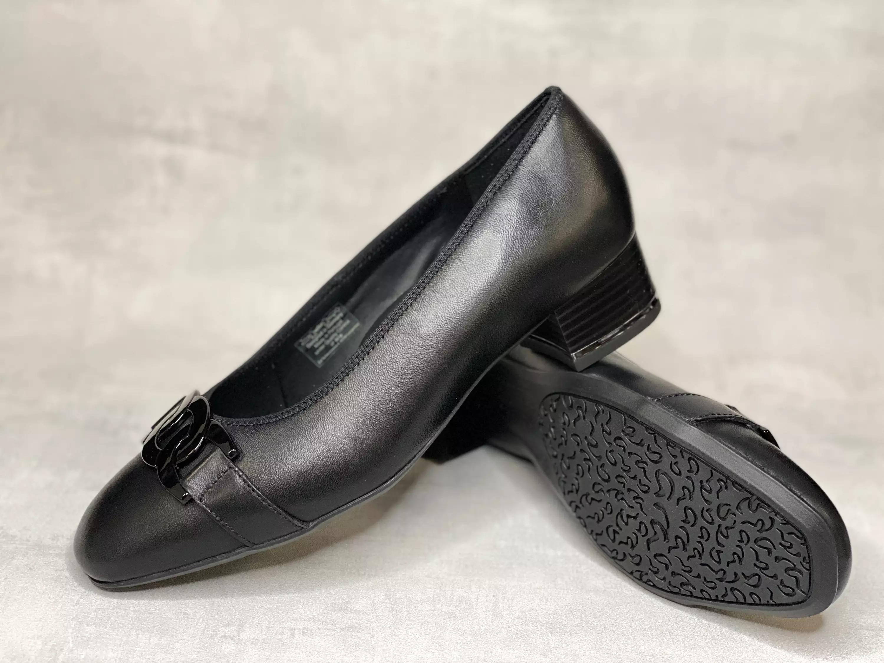 Mustat Ara H avokkaat. Avokkaissa on tukeva paksu korko, jonka alareunassa on metallinvärinen raita. Metallinen musta kärkikoriste. Avokkaiden pinta on laadukasta nahkaa ja sisäpohja varustettu ihanan pehmeällä kiinteällä Ara High Soft pohjallisella.