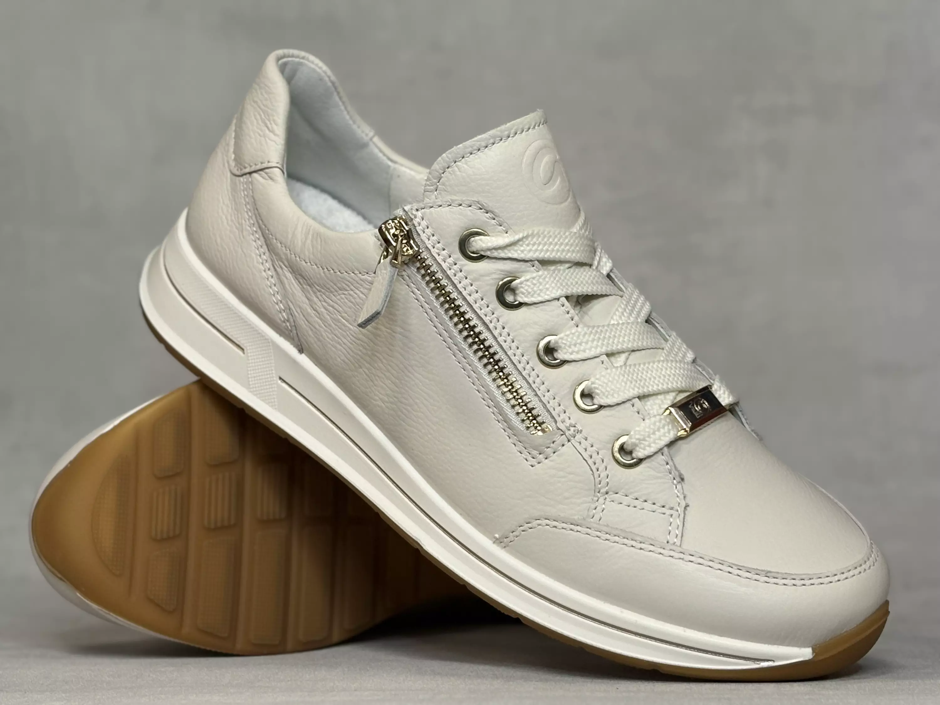 Ara Osaka kävelykengät Kermavalkoiset Ara Osaka kävelykengät. Matalavartiset nahkaiset tennarit kultaisilla yksityiskohdilla. Leveät tekstiilinauhat antavat kengälle lisäilmettä. Pehmeät... Lue lisää