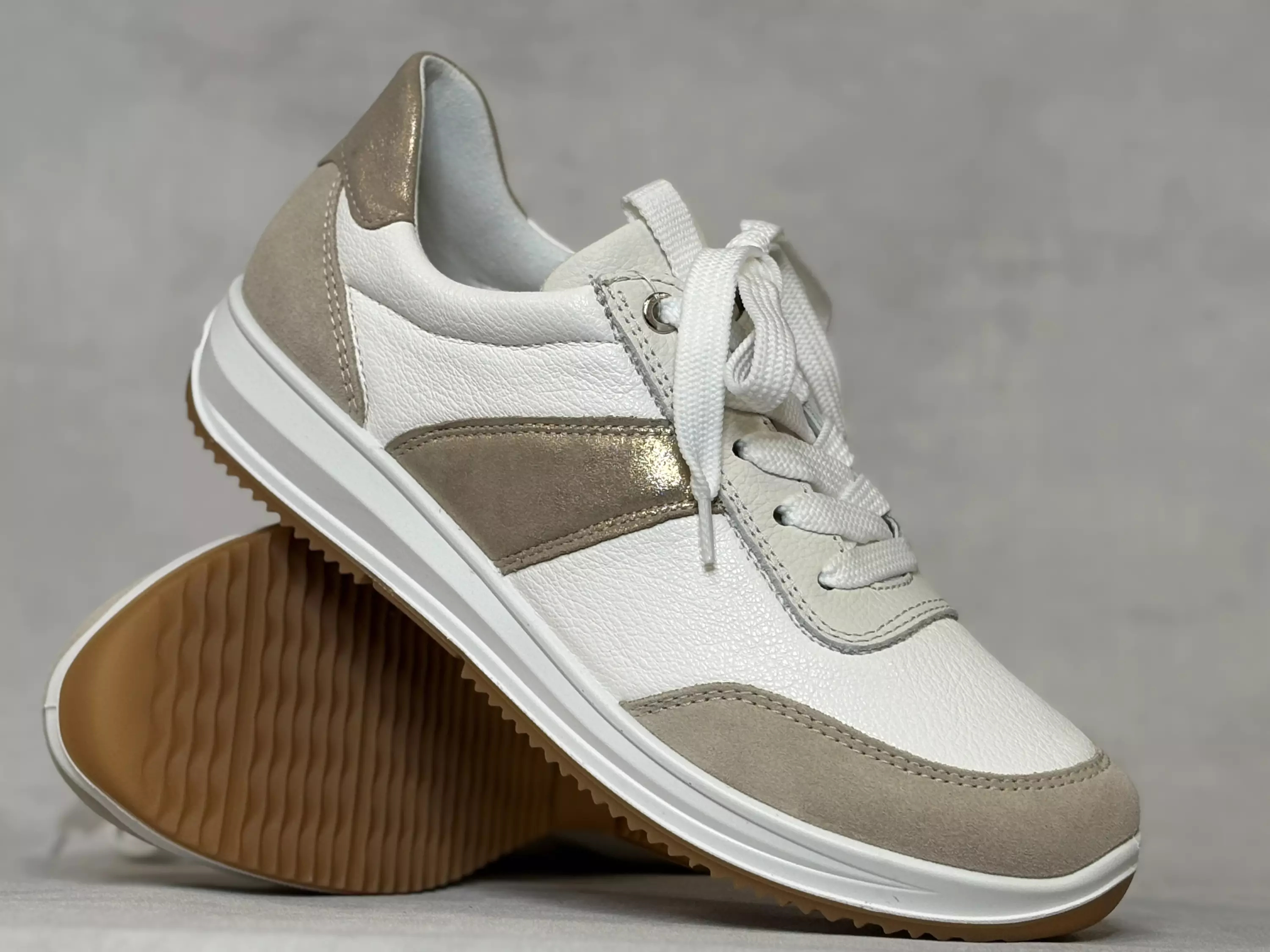 Valkoiset Ara Osaka 3.0 kävelykengät. Valkoiset nahkaiset kävelykengät beigeillä ja kullankimaltavilla yksityiskohdilla. Leveät tekstiiliset nauhat tuovat kengille ilmettä. Kenkien tekstiilinen sisävuori on bambufroteeta, vuoren kantaosassa synteettinen osio lisäämässä kestävyyttä. Pehmeät froteepintaiset Ara Highsoft pohjalliset ovat vaihdettavat, joten tarvittaessa sujautat kenkiin omia tarpeitasi parhaiten vastaavat pohjalliset. Kannan korkeus noin 3cm ja pohjan korkeus päkiän alta noin 1,5cm.