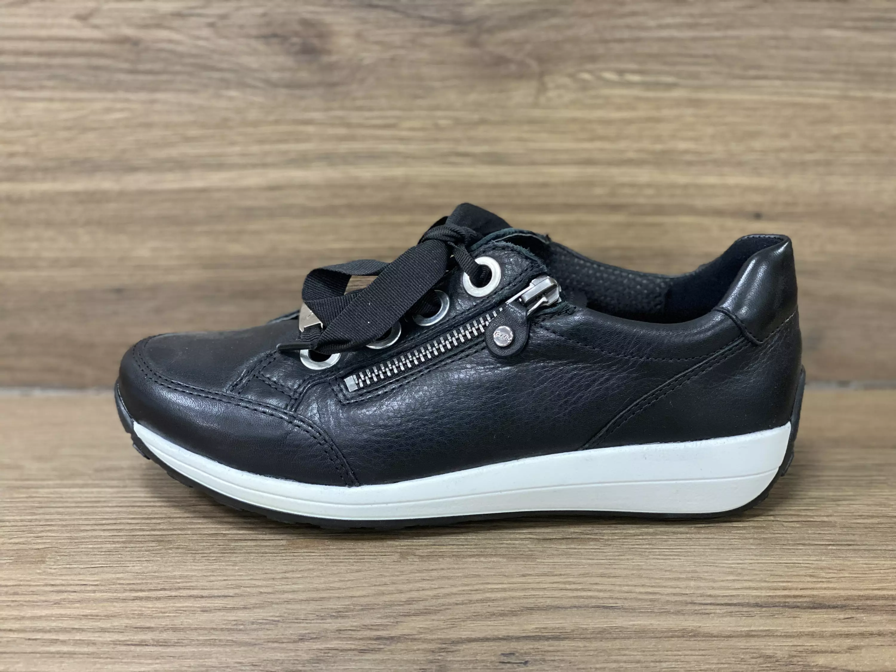 Mustat Ara Osaka kävelykengät. Ara High soft tennarit on valmistettu laadukkaasta nahasta. Ihanan pehmeävuoriset kengät, joissa on Aran muotoillut High soft-pohjalliset. Ulkosyrjällä oleva vetoketju on yksityiskohta, mutta helpottaa myös pukemista.