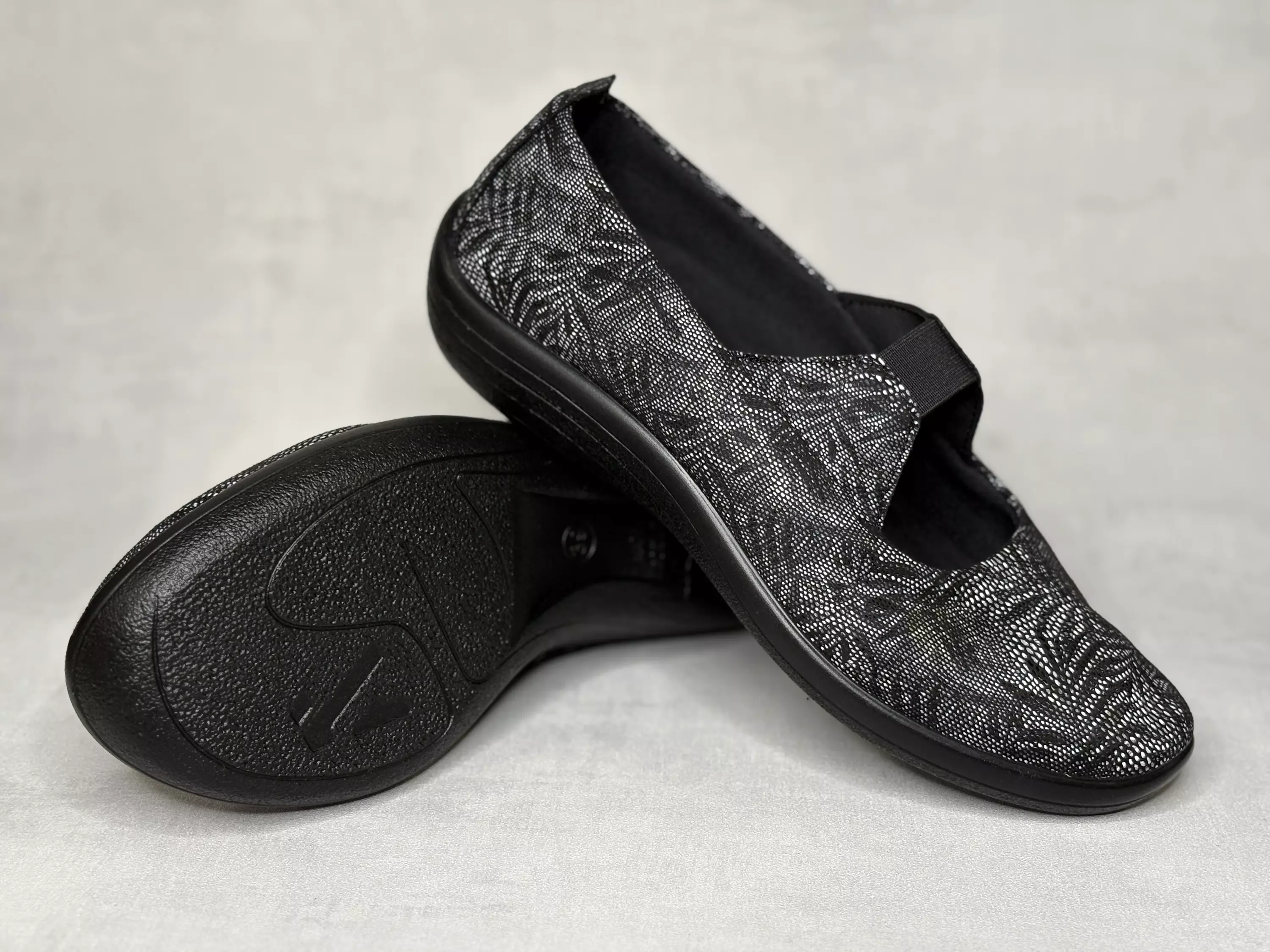 Mustat lehtikuvioiset Arcopedico K07 Itatiaia Ros Blk kävelykengät. Lehtikuvion alta pilkistävä pohjaväri on valkoinen. Venykeremmillä varustetut kevye kengät sopivat moneen eri tarkoitukseen!