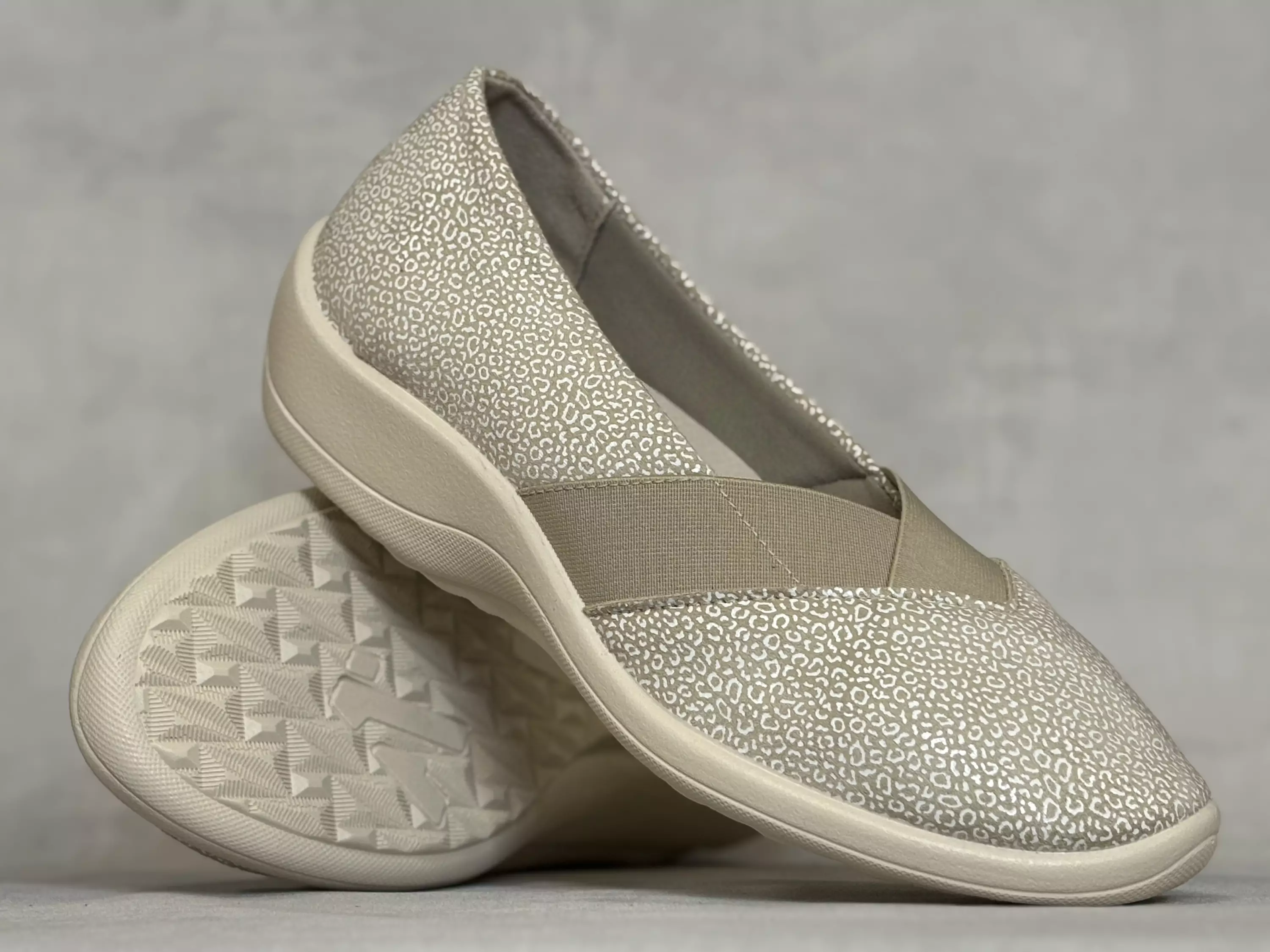 Beiget Arcopedico K47 Acadia Aiv Sahara kävelykengät. Valkoiset täpläkuviot antavat kengille pirteän ilmeen! Joustava venyke parantaa kenkien istuvuutta.Vaihdettavat pohjalliset, joten tarvittaessa sujautat kenkiin omia tarpeitasi parhaiten vastaavat pohjalliset. Kannan korkeus noin 3cm ja pohjan korkeus päkiän alta noin 1,5cm.