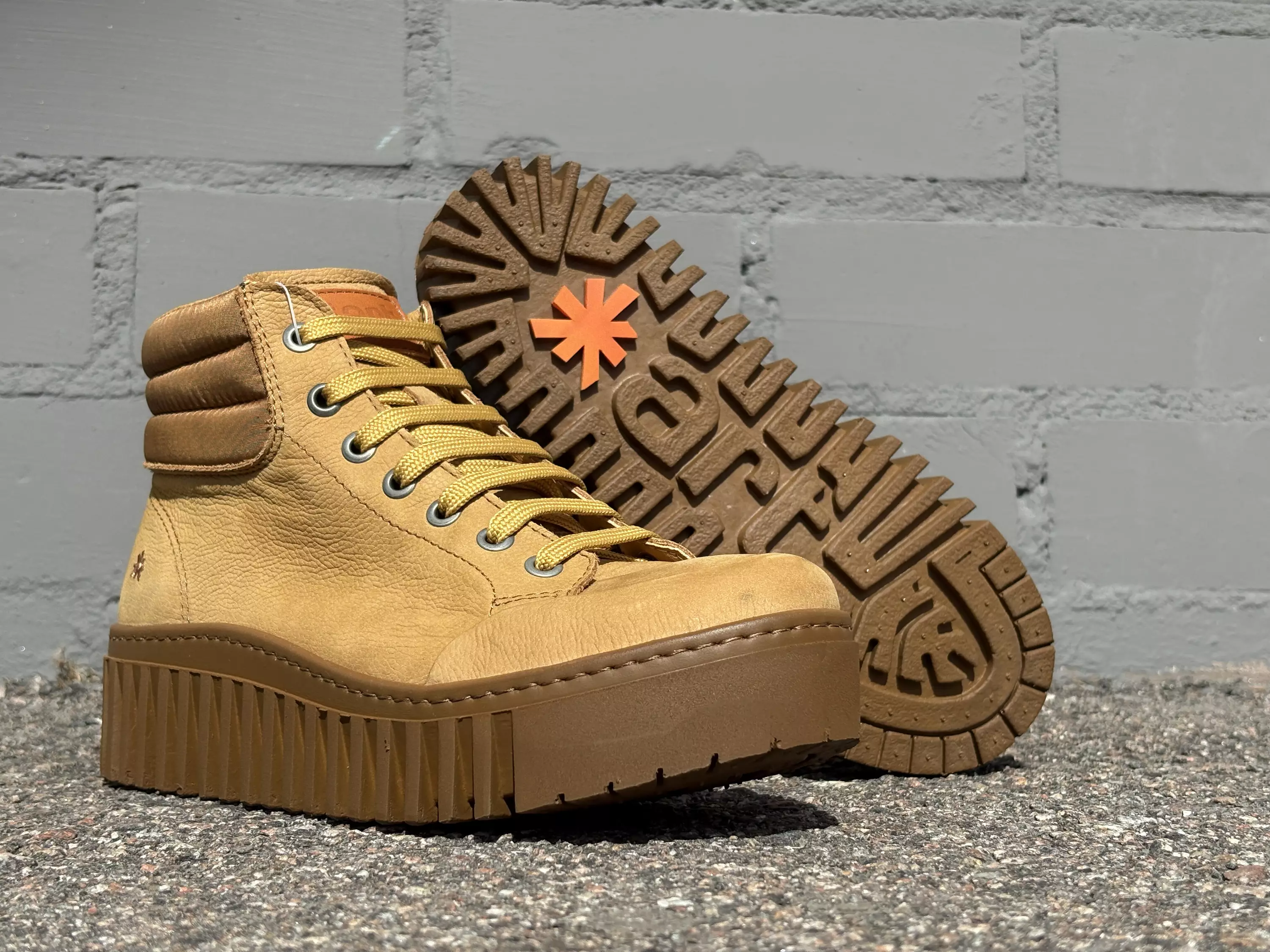 Vaaleanruskeat Art nilkkurit. Matalavartiset paksupohjaiset nilkkurit. Ruskea ulkopohja antaa kengille lisäilmettä! Pehmeä nupukkinahkainen pinta. Varrensuussa tekstiilinen koristekaitale. Iltin yläreunassa punaruskea art-merkki. Nauhojen avulla kengät on helppo säätää omaan sopivan kireälle. Ulkosyrjällä kannassa kirjailtu *-merkki. Vaihdettavat pohjalliset, joiden tilalle sujautat tarvittaessa omia tarpeitasi parhaiten vastaavat pohjalliset. Kannan korkeus noin 4cm ja pohjan korkeus päkiän alta noin 3cm.