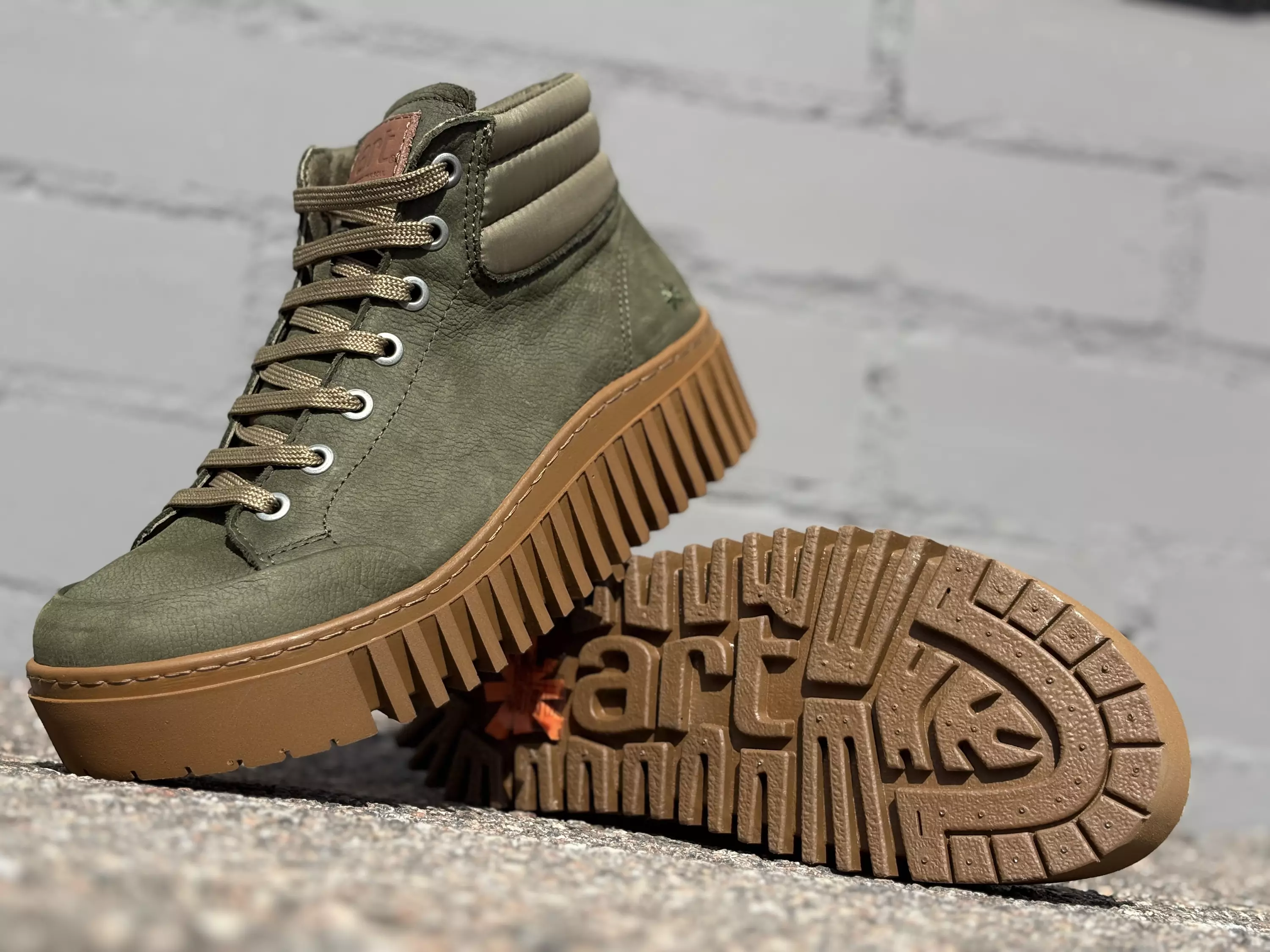 Khakin vihreät Art nilkkurit. Matalavartiset paksupohjaiset nilkkurit. Ruskea ulkopohja antaa kengille lisäilmettä! Pehmeä nupukkinahkainen pinta. Varrensuussa tekstiilinen koristekaitale. Iltin yläreunassa ruskea art-merkki. Nauhojen avulla kengät on helppo säätää omaan sopivan kireälle. Ulkosyrjällä kannassa kirjailtu *-merkki. Vaihdettavat pohjalliset, joiden tilalle sujautat tarvittaessa omia tarpeitasi parhaiten vastaavat pohjalliset. Kannan korkeus noin 4cm ja pohjan korkeus päkiän alta noin 3cm.