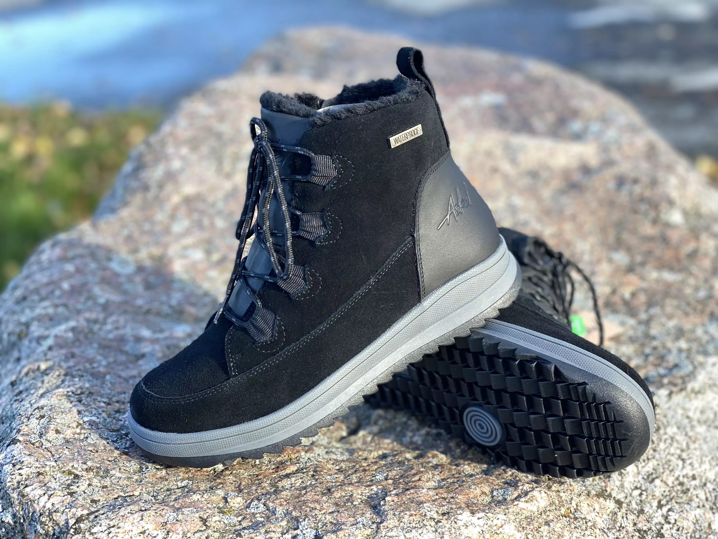 Mustat Askel talvinilkkurit. Vettä hylkiviksi käsitellyt mokkanahkaiset Waterproof-nilkkurit. Sisäsyrjälle sijoitettu vetoketju vauhdittaa pukemista ja nauhoilla kengät säätyvät helposti oman jalkaan sopiviksi. Kannassa vetolenkki. Pörröpintaiset pohjalliset ovat vaihdettavat, joten tarvittaessa vaihdat kenkiin omia tarpeitasi parhaiten vastaavat pohjalliset. Kannan korkeus noin 3cm ja pohjan korkeus noin 2cm.