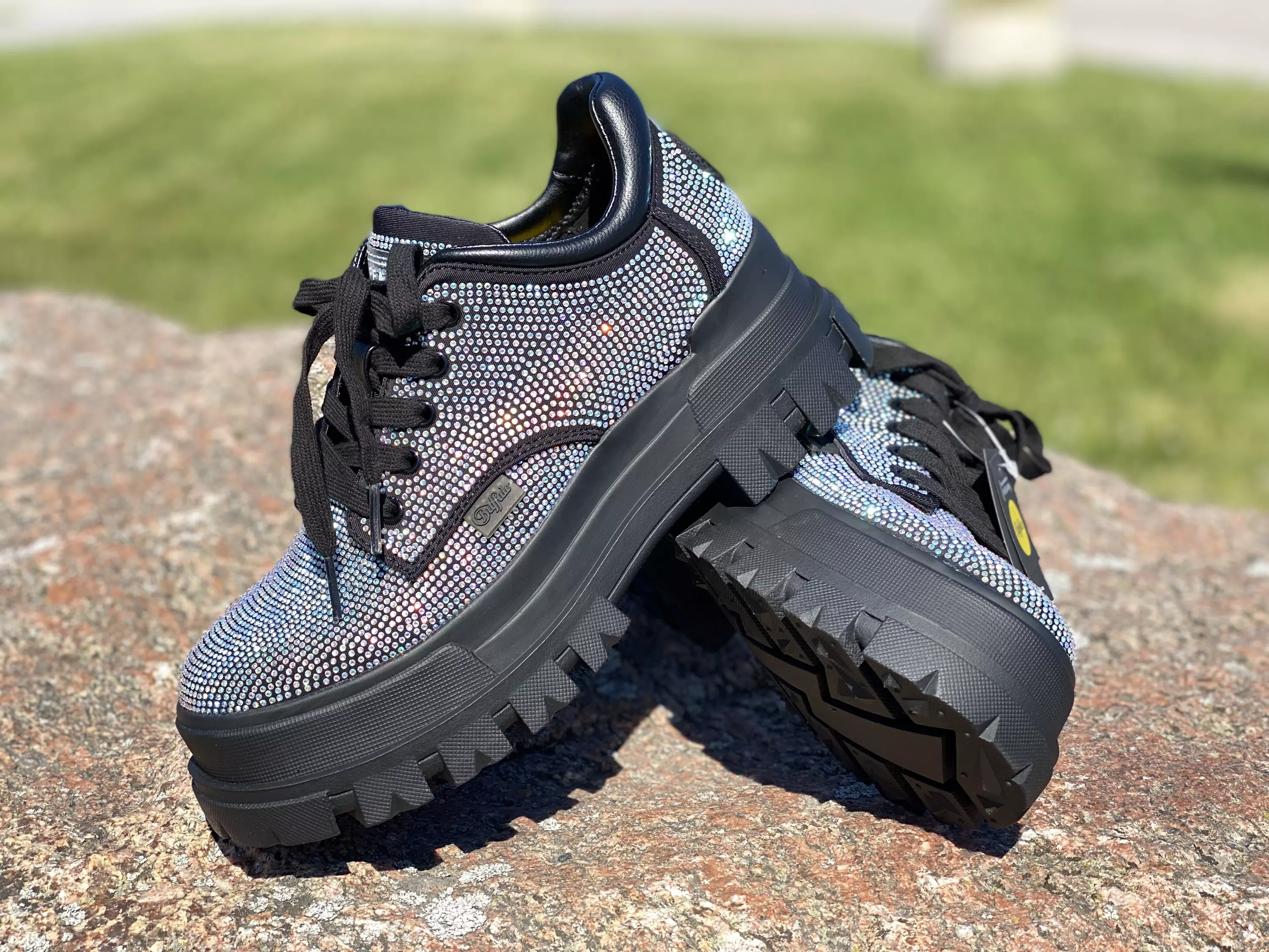 Mustat strassikoristeiset Buffalo Aspha CLS Glam kävelykengät. paksupohjaiset nauhalliset kävelykengät. Vaihdettavat pohjalliset, joiden tilalle sujautat tarvittaessa omia tarpeitasi parhaiten vastaavat pohjalliset. Huomioi, että kengät ovat pohjan rakenteen vuoksi painavat.