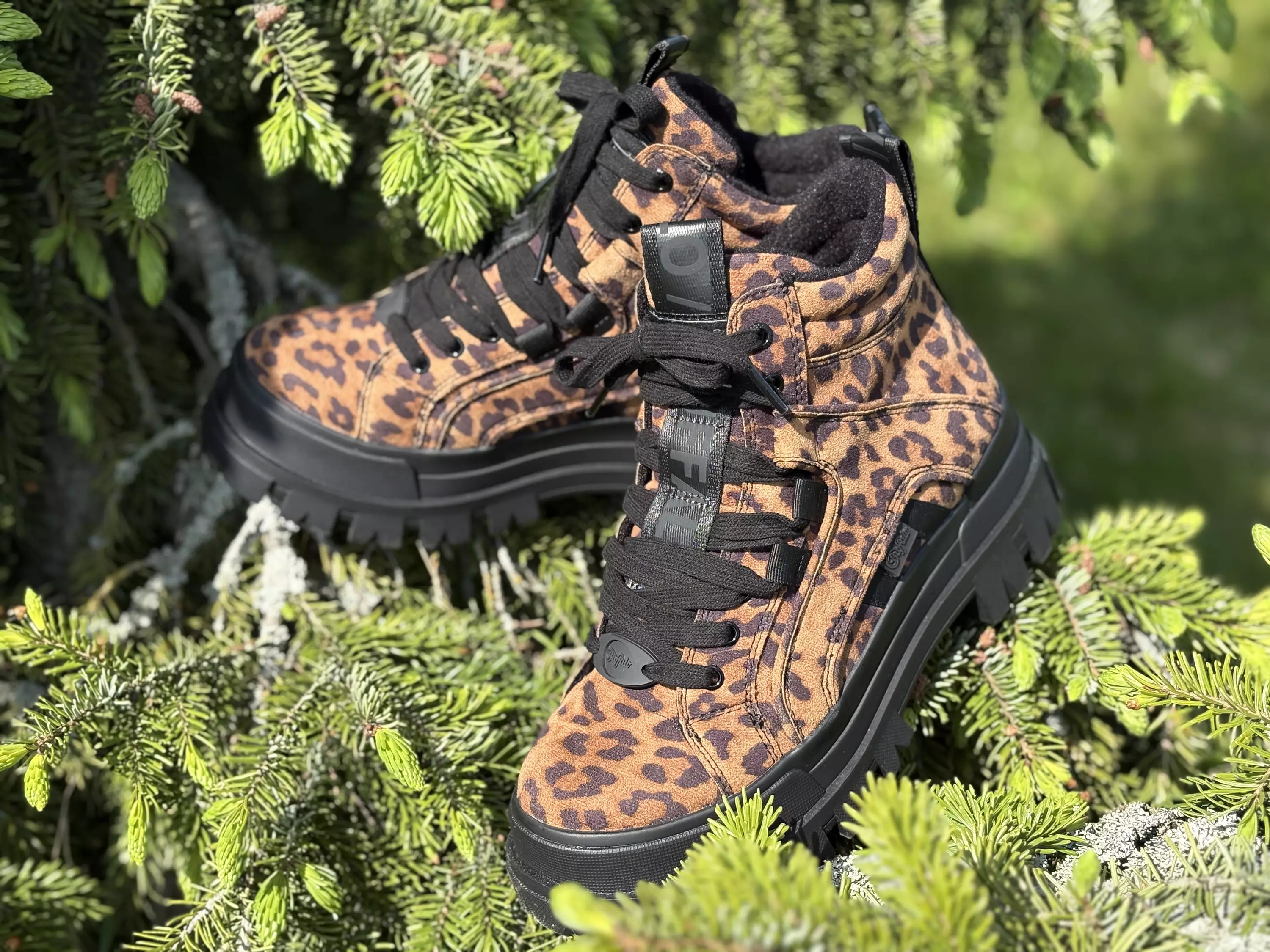 Paksupohjaiset leopardikuvioiset Buffalo Aspha Mid Leo nilkkurit. Päräyttävä ulkonäkö, runsaasti näyttäviä leikkauksia ja värinä viimeistä huutoa oleva leopardikuvio! Kengissä on jalkaan mukautuva Memory Foam pohjallinen, joka on myös vaihdettavissa, joten tarvittaessa sujautat kenkiin omia tarpeitasi parhaiten vastaava pohjalliset. Tarvittaessa pohjallisia voi myös kerrostaa kengän sisälle. Kannan korkeus noin 5cm ja pohjan korkeus päkiän alta noin 3cm.