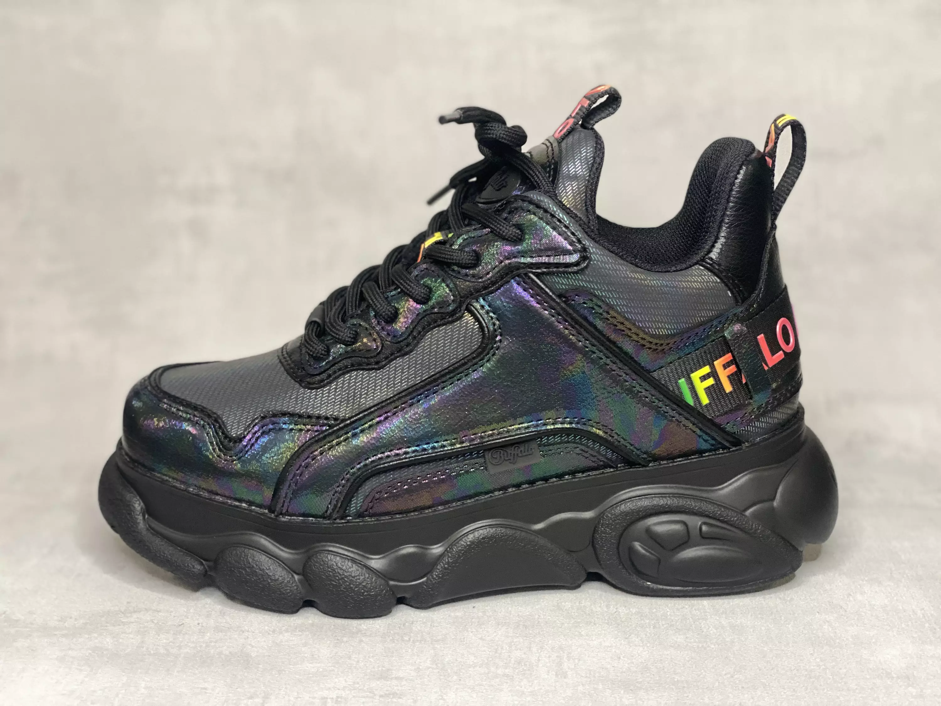 Moniväriset sateenkaarenkirjavat Buffalo CLD Chai Rainbow lenkkarit. Kenkien väri elää kameleonttimaisesti valon mukana ja pinnasta erottaa kutakuinkin kaikki sateenkaaren värit. Kantakappaleessa musta tekstiiliosio, jossa sateenkaarenkirjava Buffalo-teksti. Nauhojen avulla kengät säätyvät sopivan kireälle omaan jalkaan. Pehmeät, jalan alla mukautuvat pohjalliset ovat myös vaihdettavat, joten tarvittaessa vaihdat kenkiin omi tarpeitasi parhaiten vastaavat pohjalliset. Iltissä ja kantakappaleessa on tekstiilinen vetolenkki. Kannan korkeus noin 5cm ja pohjan korkeus päkiän alta noin 3cm.