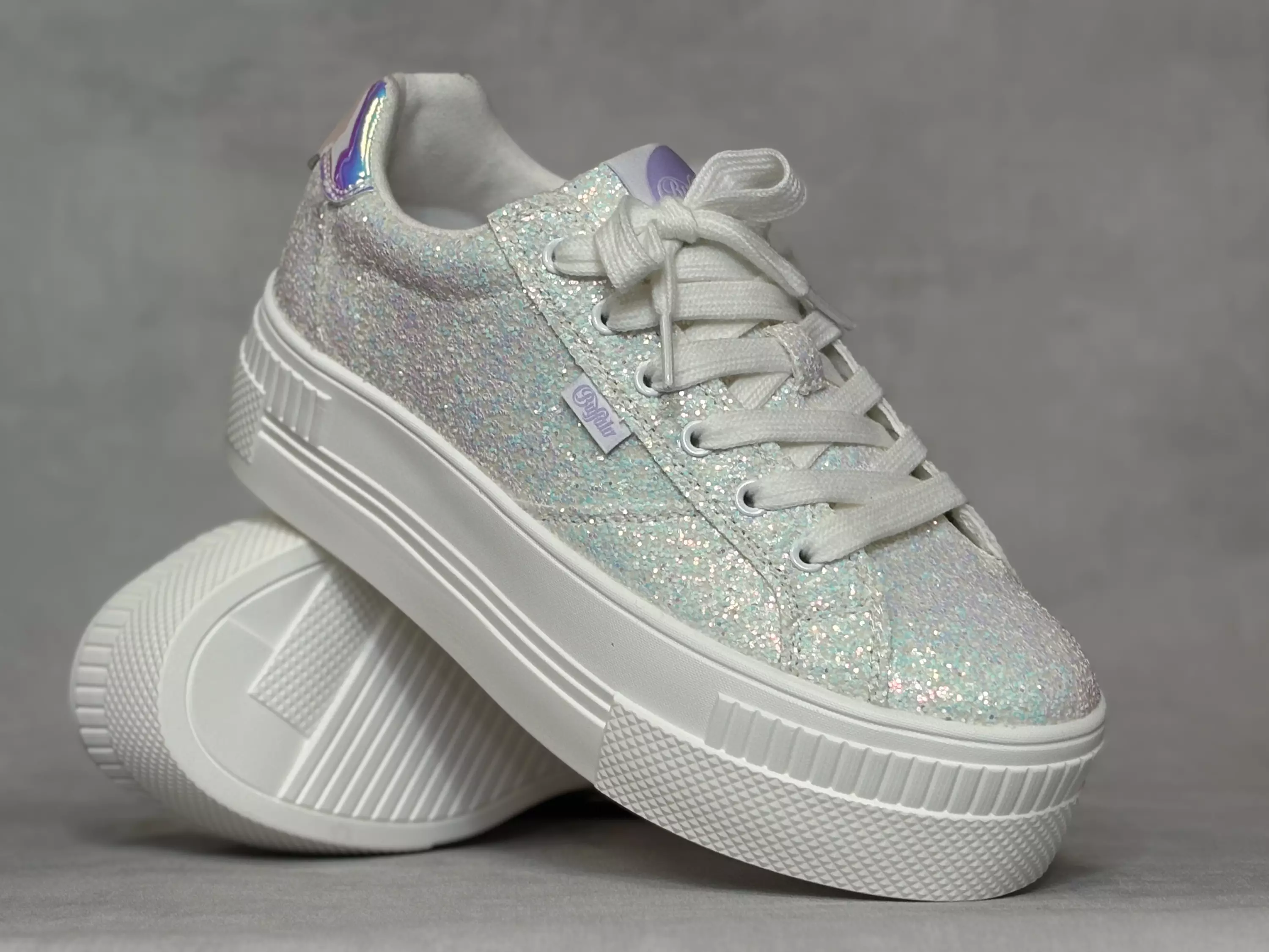 Moniväriset paksupohjaiset Buffalo Paired Glam - White Mermaid tennarit. Upea glitterpinta, joka heijastaa valoa vaaleansinisen ja vaaleanpunaisen sävyissä. Kannassa upeasti valoa heijastava kappale, josta valo taittuu sinisen, vioeltin ja vaaleanpunaisen sävyissä. Nauhojen avulla kengät on helppo säätää omaan jalkaan sopiviksi. Lestimitoitus normaali/leveähkö. Kannan korkeus noin 5cm ja pohjan korkeus päkiän päkiän alta noin 3cm.