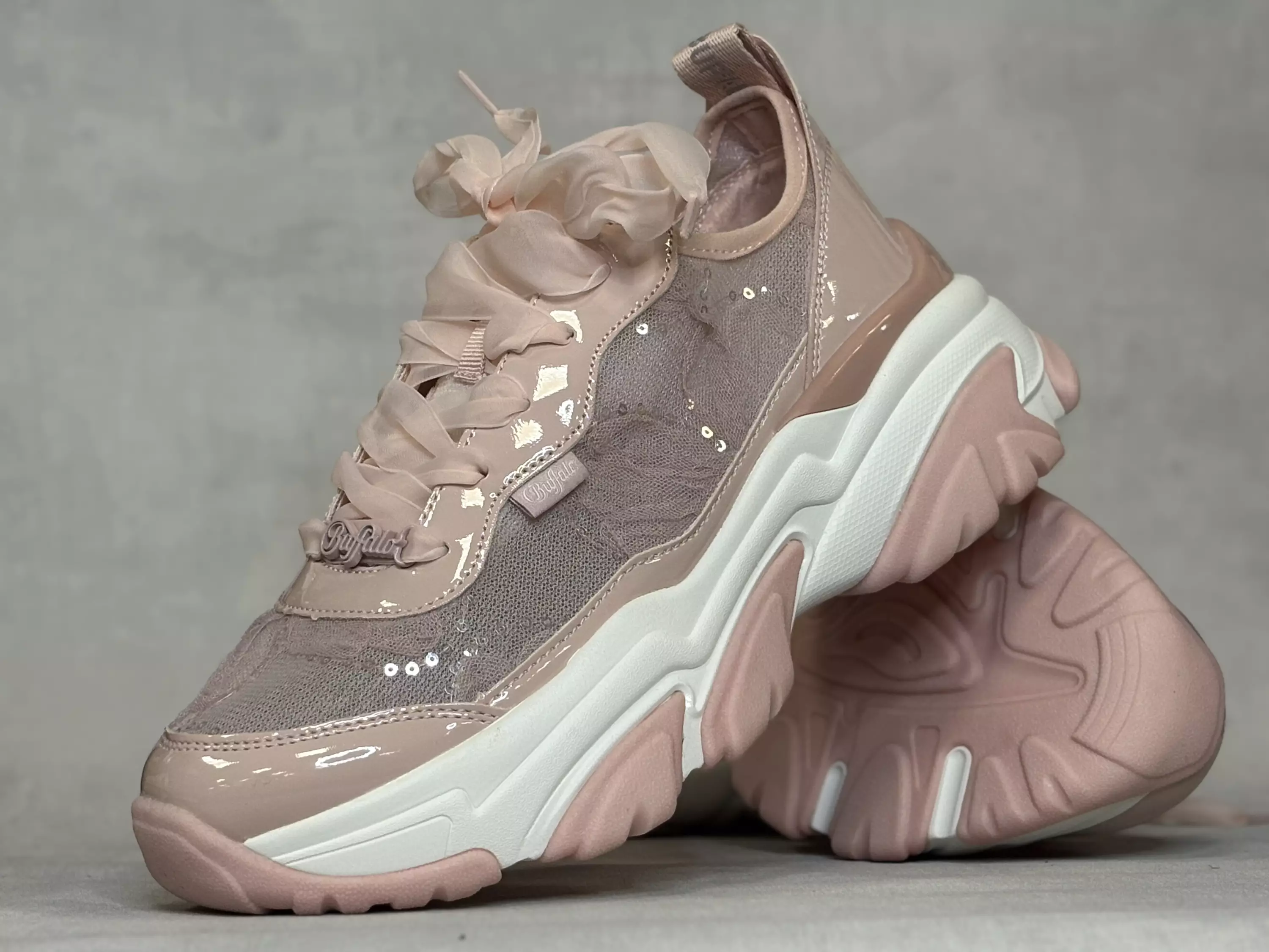 Vaaleanpunaiset Buffalo Renee Bloom lenkkarit. Näyttävät tyllikuvioidut lenkkarit paljettikoristeilla. Läpinäkyvä mesh-pinta. Vaaleanpunaiset läpinäkyvät nauhat. Vaihdettavat pohjalliset, joten tarvittaessa kenkiin sujahtaa juuri sinun tarpeitasi vastaavat pohjalliset. Lestimitoitus normaali/leveähkö. Kannan korkeus noin 5,5cm ja pohjan korkeus päkiän alta noin 3,5cm.