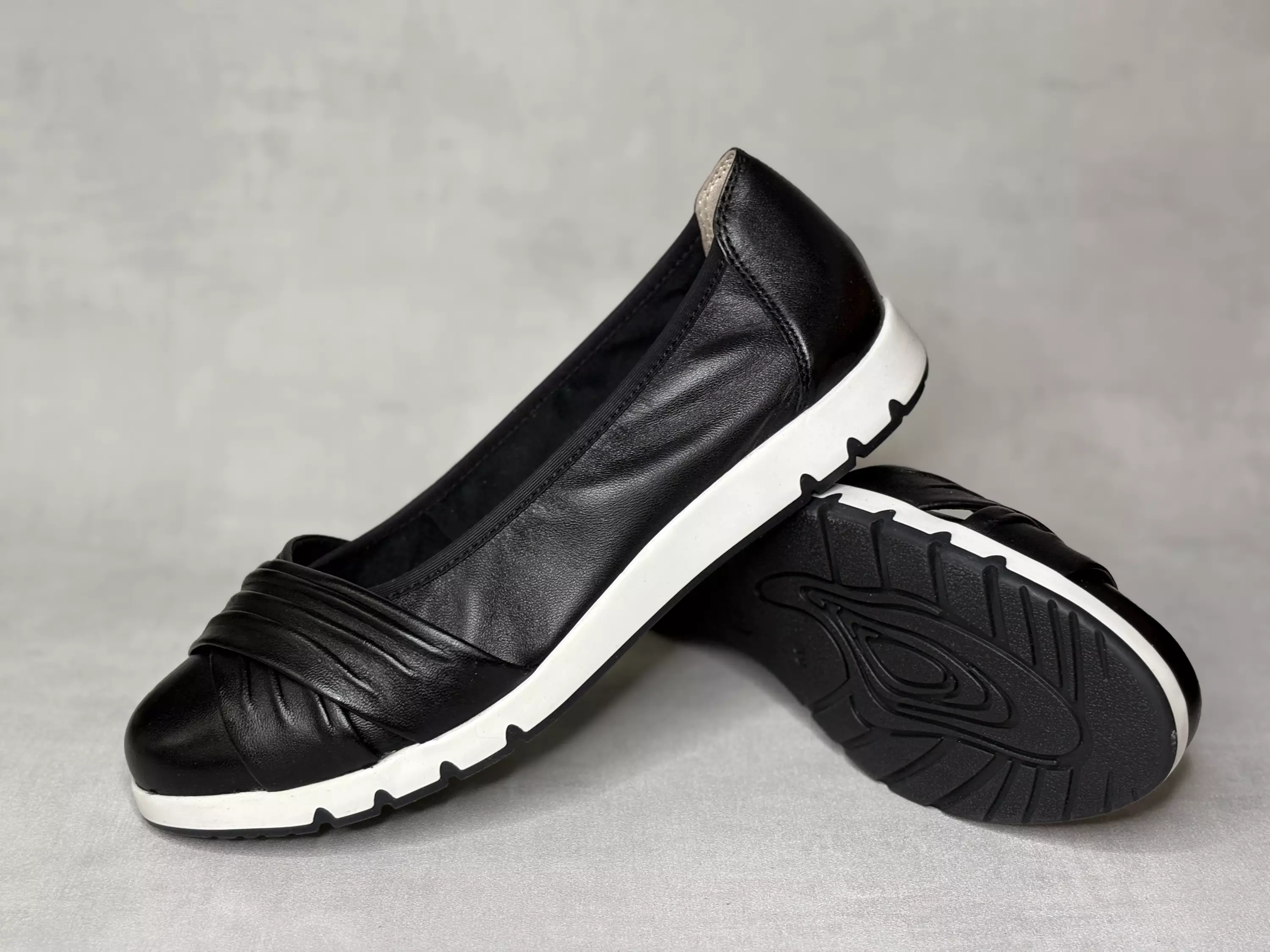 Mustat Caprice ballerinat. Nahkaiset H-lestiset ballerinat. Vaihdettavat pohjalliset, joten tarvittaessa sujautat kenkiin omia tarpeitasi parhaiten vastaavat pohjalliset. Kannan korkeus noin 2cm, pohjan korkeus päkiän alta noin 1,5cm.
