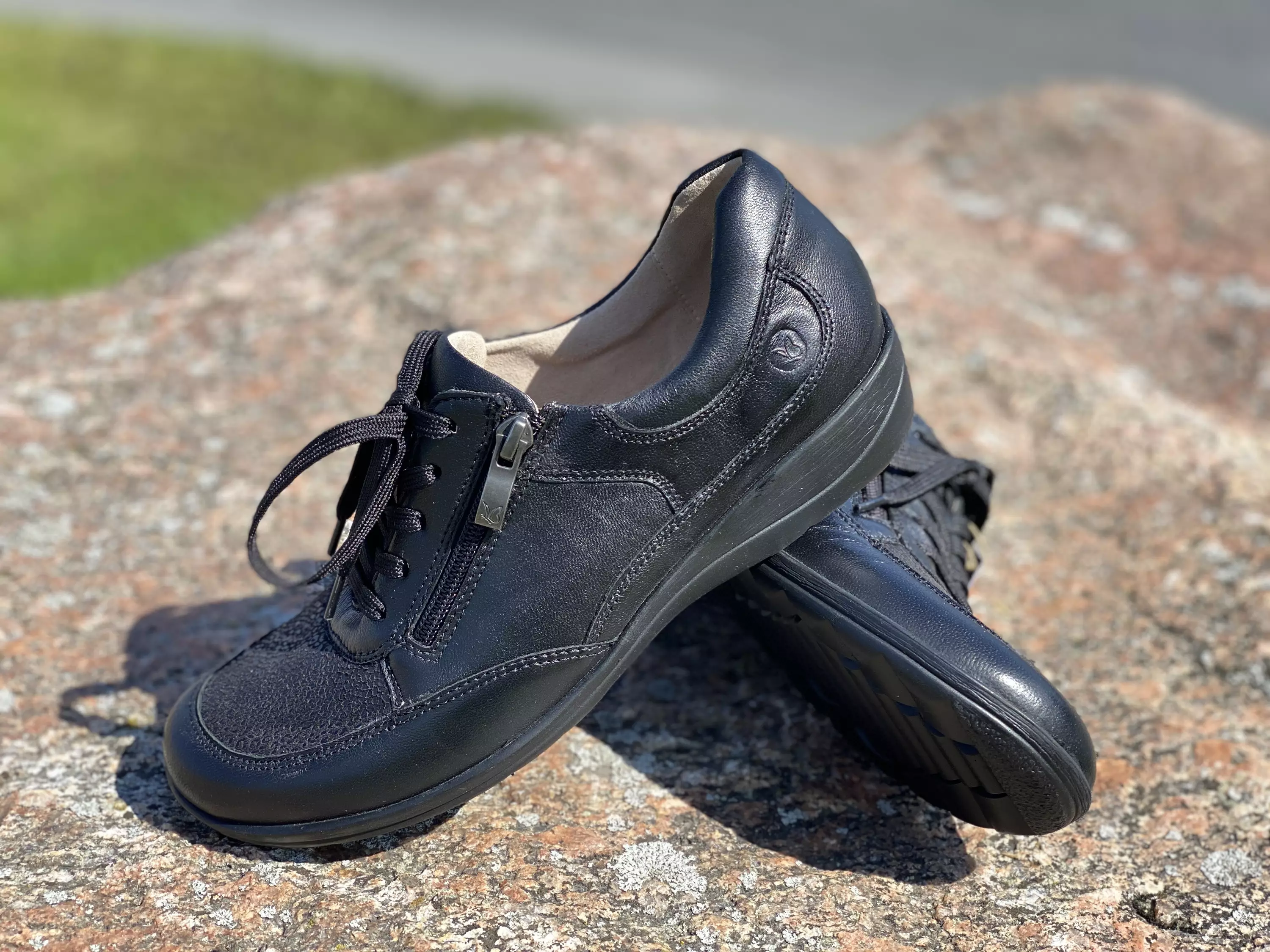 Mustat Caprice kävelykengät. Nahkapintaiset kengät, joiden sisäsyrjällä ja kärjessä on joustava tekstiilinen osio. Sopii siis mainiosti esimerkiksi vaivaisenluulliseen jalkaan, sillä pinta myötäilee jalan muotoa, antaen tarvittaviin kohtiin riittävästi tilaa. Nauhojen avulla kengät on helppo kiristää omaan jalkaan sopiviksi ja vetoketju vauhdittaa pukemista. Vaihdettavat nahkapintaiset pohjalliset, joten tarvittaessa sujautat näihin kenkiin omia tarpeitasi parhaiten vastaavat pohjalliset.