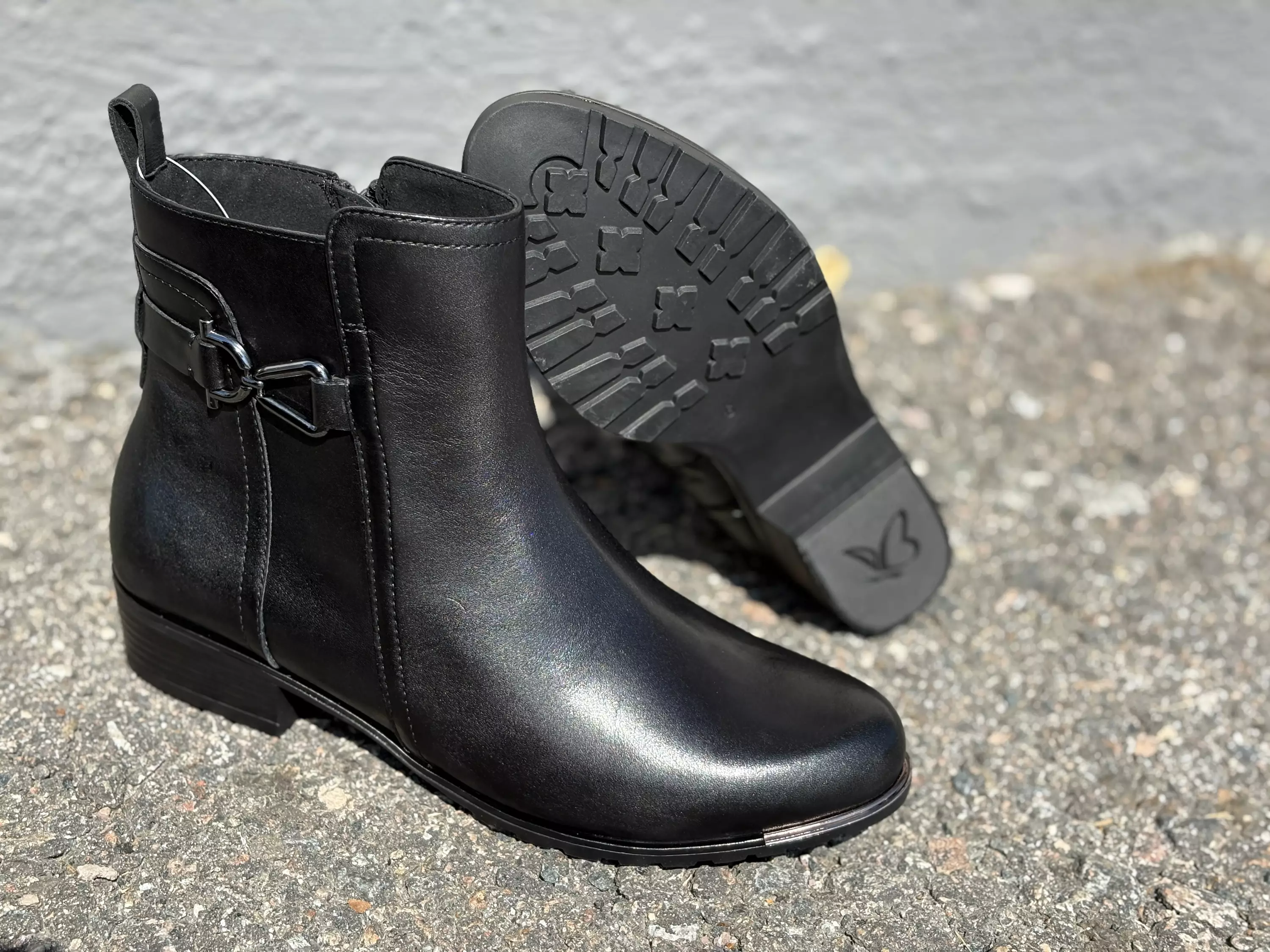 Mustat Caprice nilkkurit. Matalakorkoiset klassiset nahkanilkkurit. Ulkosyrjällä metallin värinen koristesolki ja kärjessä metallinen yksityiskohta. Nilkkurin sisäsyrjällä pukemista helpottava vetoketju. Varren takaosassa pieni vetolenkki. Tekstiilipintaiset Caprice Blue Oxygen-pohjalliset ovat vaihdettavat, joten tarvittaessa sujautat kenkiin omia tarpeitasi parhaiten vastaavat pohjalliset. Lestimitoitukseltaan kengät ovat normaalia (G) lestimitoitusta. Kannan korkeus noin 3,5cm ja pohjan korkeus päkiän alta noin 1cm.