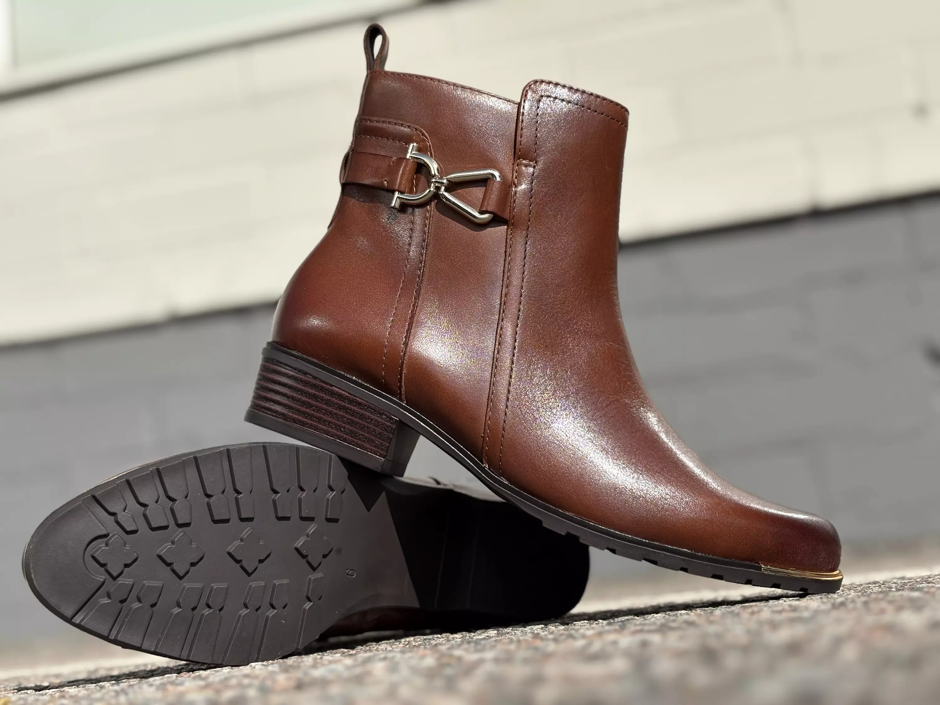 Konjakinruskeat Caprice nilkkurit. Matalakorkoiset klassiset nahkanilkkurit. Ulkosyrjällä kullan värinen koristesolki ja kärjessä kullan värinen yksityiskohta. Nilkkurin sisäsyrjällä pukemista helpottava vetoketju. Varren takaosassa pieni vetolenkki. Tekstiilipintaiset Caprice Blue Oxygen-pohjalliset ovat vaihdettavat, joten tarvittaessa sujautat kenkiin omia tarpeitasi parhaiten vastaavat pohjalliset. Lestimitoitukseltaan kengät ovat normaalia (G) lestimitoitusta. Kannan korkeus noin 3,5cm ja pohjan korkeus päkiän alta noin 1cm.