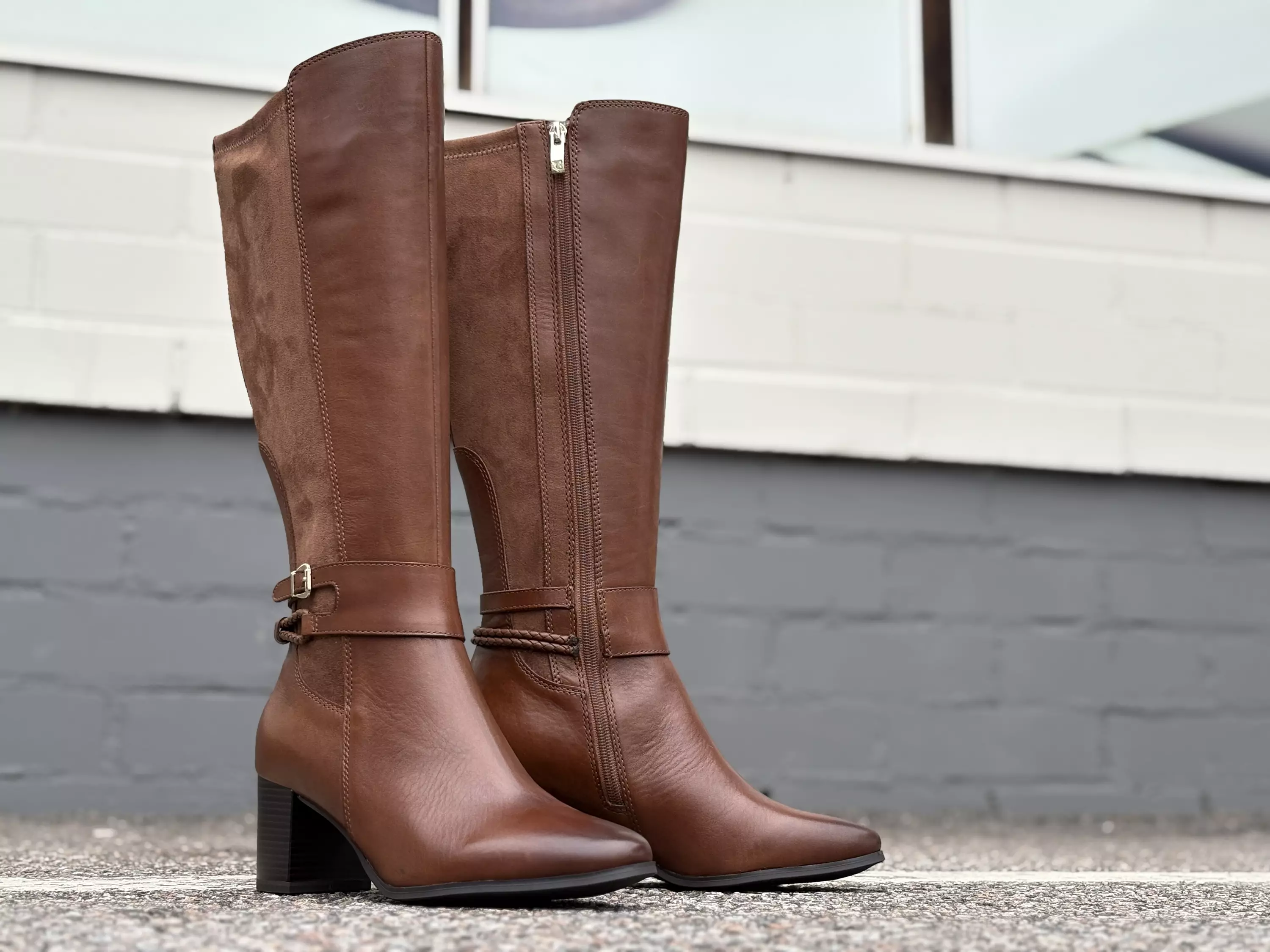 Konjakinruskeat Caprice nahkasaappaat. Korolliset nahkasaappaat ovat saaneet koristuksekseen soljellisen nilkkaremmin, jonka allaon punoskoristeinen remmi. Tyylikäs kapeneva kärki. Lestimitoitus normaali G lesti. Varren takaosa on hieman joustavaa tekstiiliä, jonka ansiosta varsi istuu mukavasti jalassa. Nahkasaappaiden vuori on pehmeää matalanukkaista teddyä. Pohjallisen pinta on samaa pehmeää tekstiiliä. Sisäsyrjälle sijoitettu vetoketju vauhdittaa pukemista. Koron korkeus noin 6cm ja pohjan korkeus päkiän alta noin 1cm.