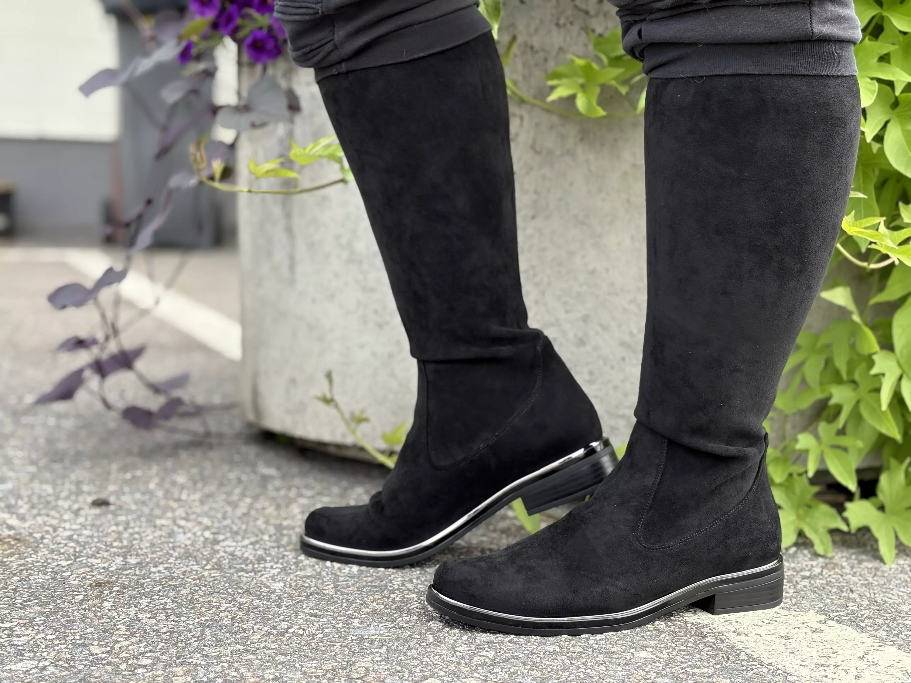 Mustat Caprice saappaat. Tekstiiliset joustavavartiset saappaat. Varsiosan voi vetää jalkaan suoraksi tai jättää laskostetuksi. Pohjan reunassa hopean värinen raita. Lestimitoitus normaali (G). Kannan korkeus noin 3cm ja pohjan korkeus päkiän alta noin 1cm.
